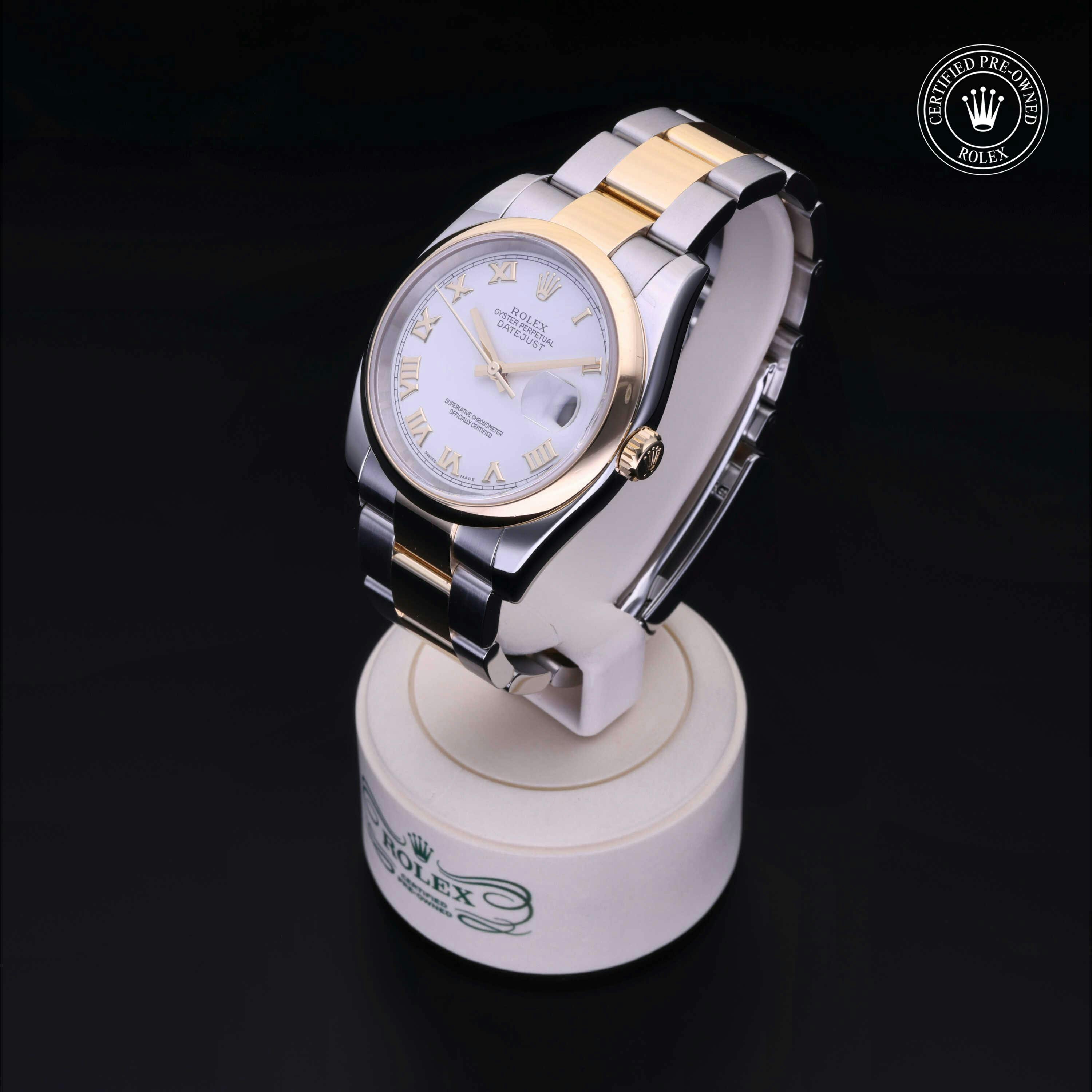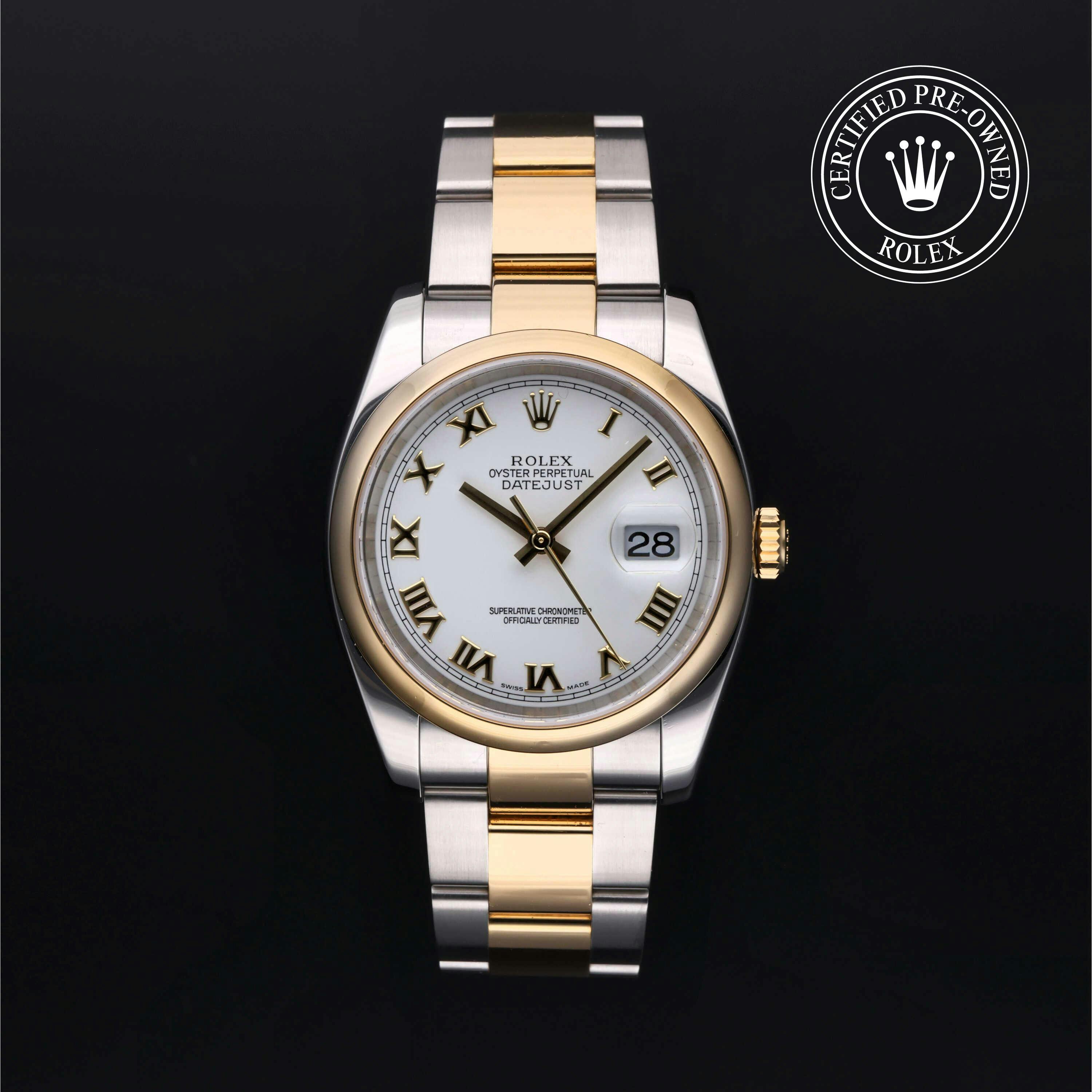 Rolex Certified Pre-Owned Datejust (116203) self - winding automatic watch, features a 36mm stainless steel case with an 18k yellow gold domed bezel surrounding a white dial on an 18k yellow gold oyster bracelet. Functions include hours, minutes, seconds and date. This watch has received Rolex-authorized service and certification. It comes with the original box and papers, and includes a custom Rolex Certified Pre-Owned hang tag, travel pouch and RCPO international warranty card.