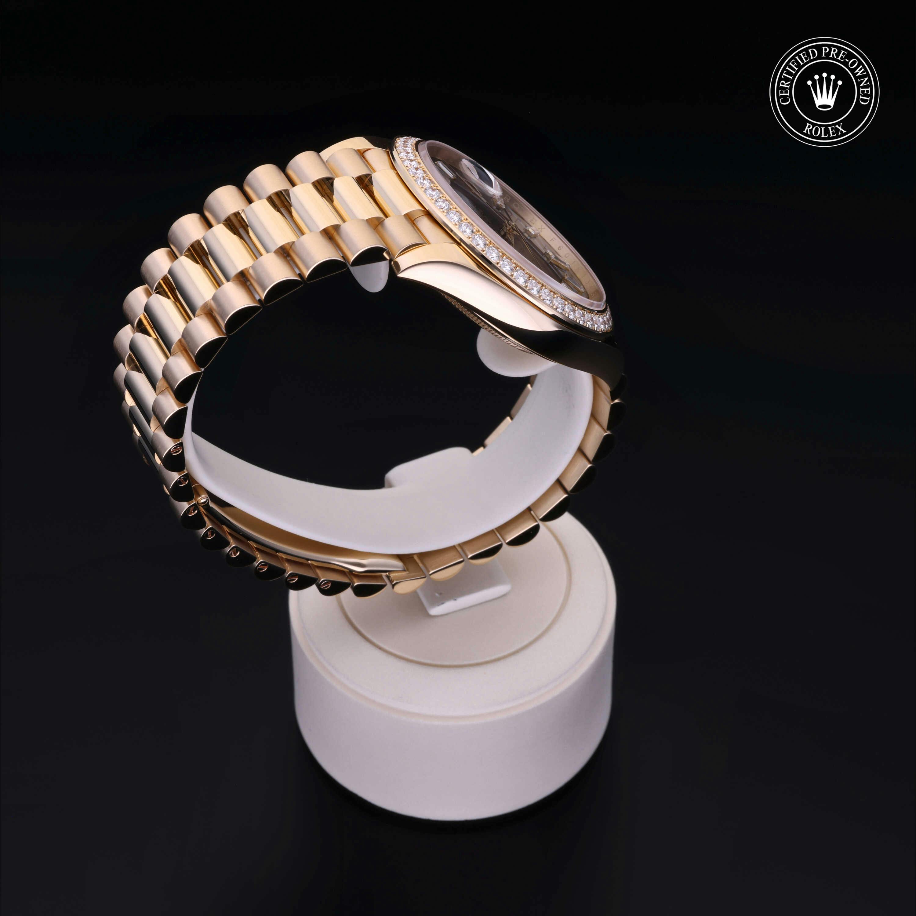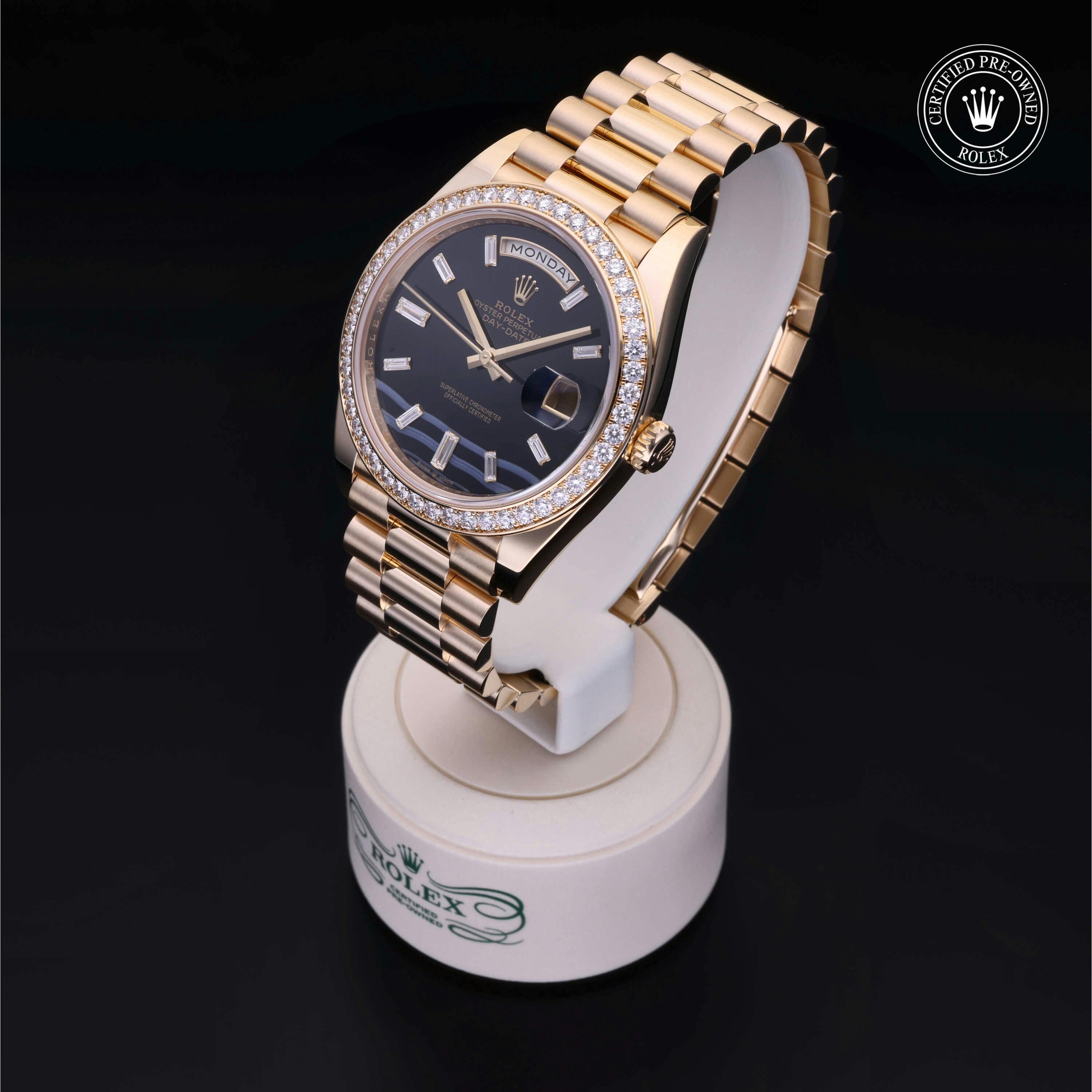 Rolex Certified Pre-Owned Day-Date (228348RBR) self - winding automatic watch, features a 40mm 18k yellow gold case and diamond set bezel surrounding an onyx diamond set dial on an 18k yellow gold president bracelet. Functions include hours, minutes, seconds, date and day. This watch has received Rolex-authorized service and certification. It comes with the original box and papers, and includes a custom Rolex Certified Pre-Owned hang tag, travel pouch and RCPO international warranty card.