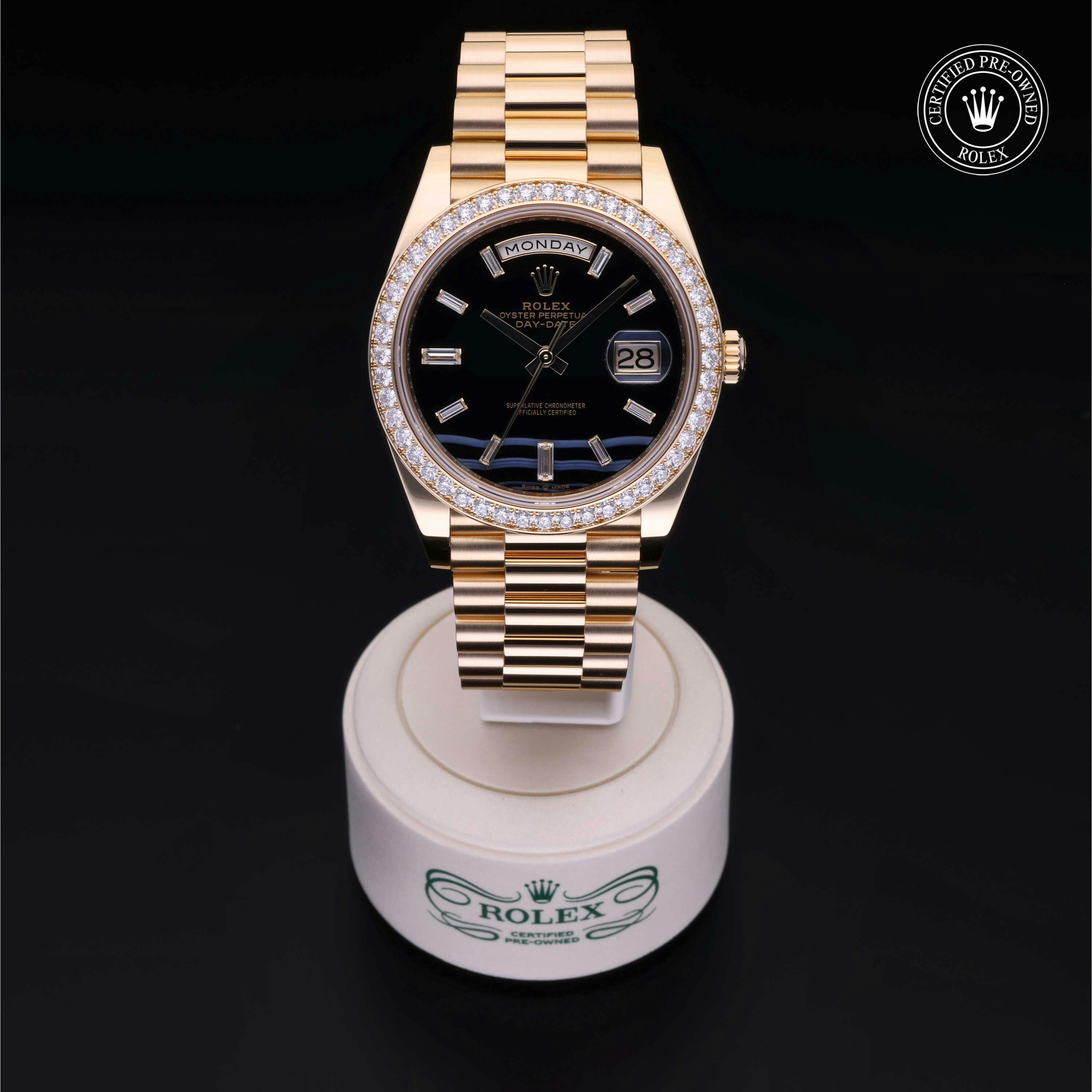 Rolex Certified Pre-Owned Day-Date (228348RBR) self - winding automatic watch, features a 40mm 18k yellow gold case and diamond set bezel surrounding an onyx diamond set dial on an 18k yellow gold president bracelet. Functions include hours, minutes, seconds, date and day. This watch has received Rolex-authorized service and certification. It comes with the original box and papers, and includes a custom Rolex Certified Pre-Owned hang tag, travel pouch and RCPO international warranty card.