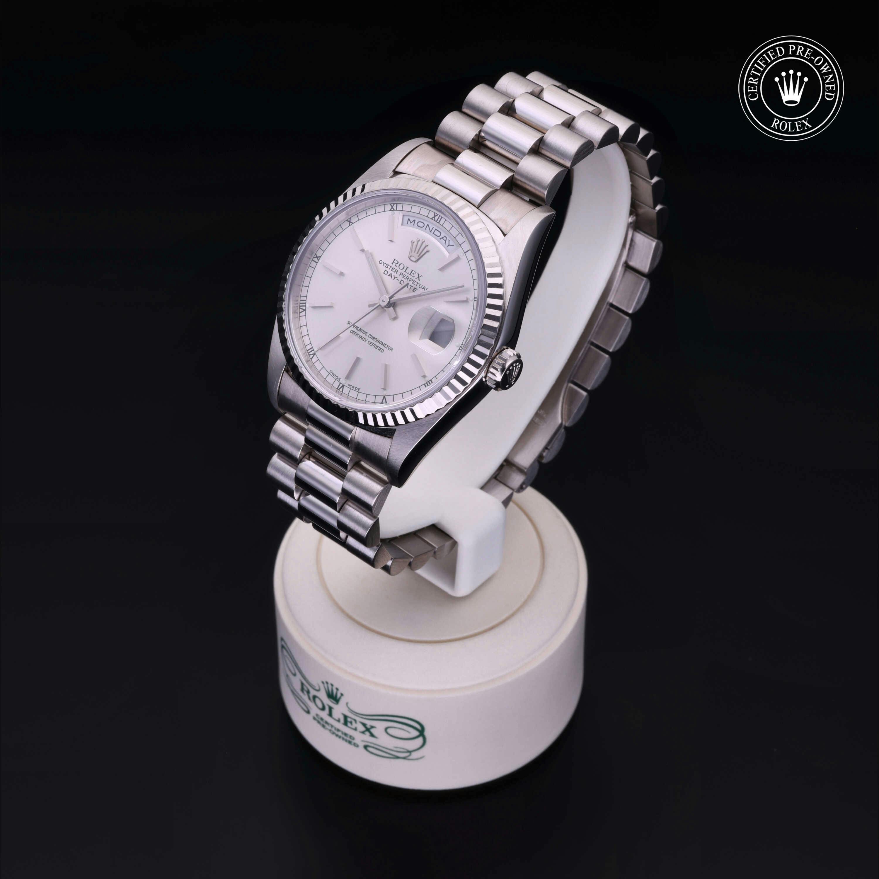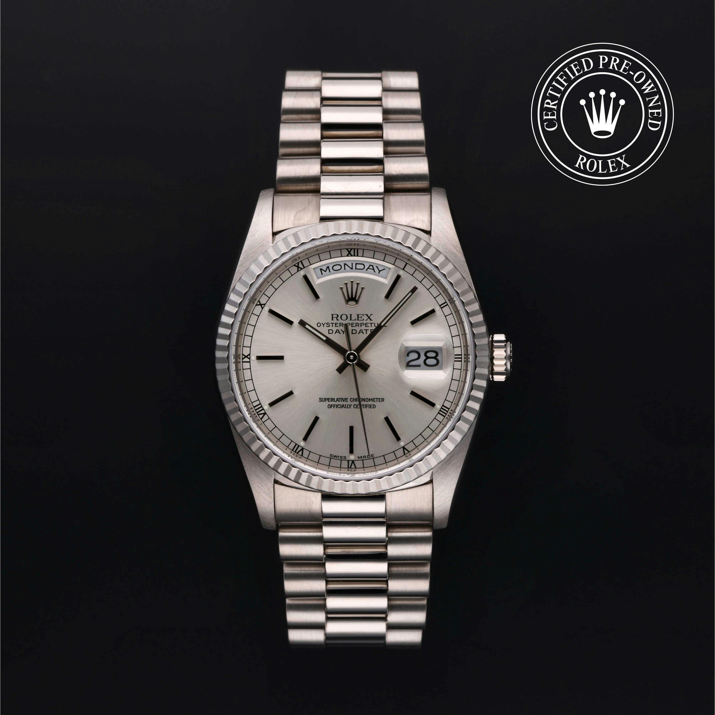 Rolex Certified Pre-Owned Day-Date (18239) self - winding automatic watch, features a 36mm 18k white gold case and fluted bezel surrounding a silver dial on an 18k white gold president bracelet. Functions include hours, minutes, seconds, date and day. This watch has received Rolex-authorized service and certification. It comes with the original box, and includes a custom Rolex Certified Pre-Owned hang tag, travel pouch and RCPO international warranty card.