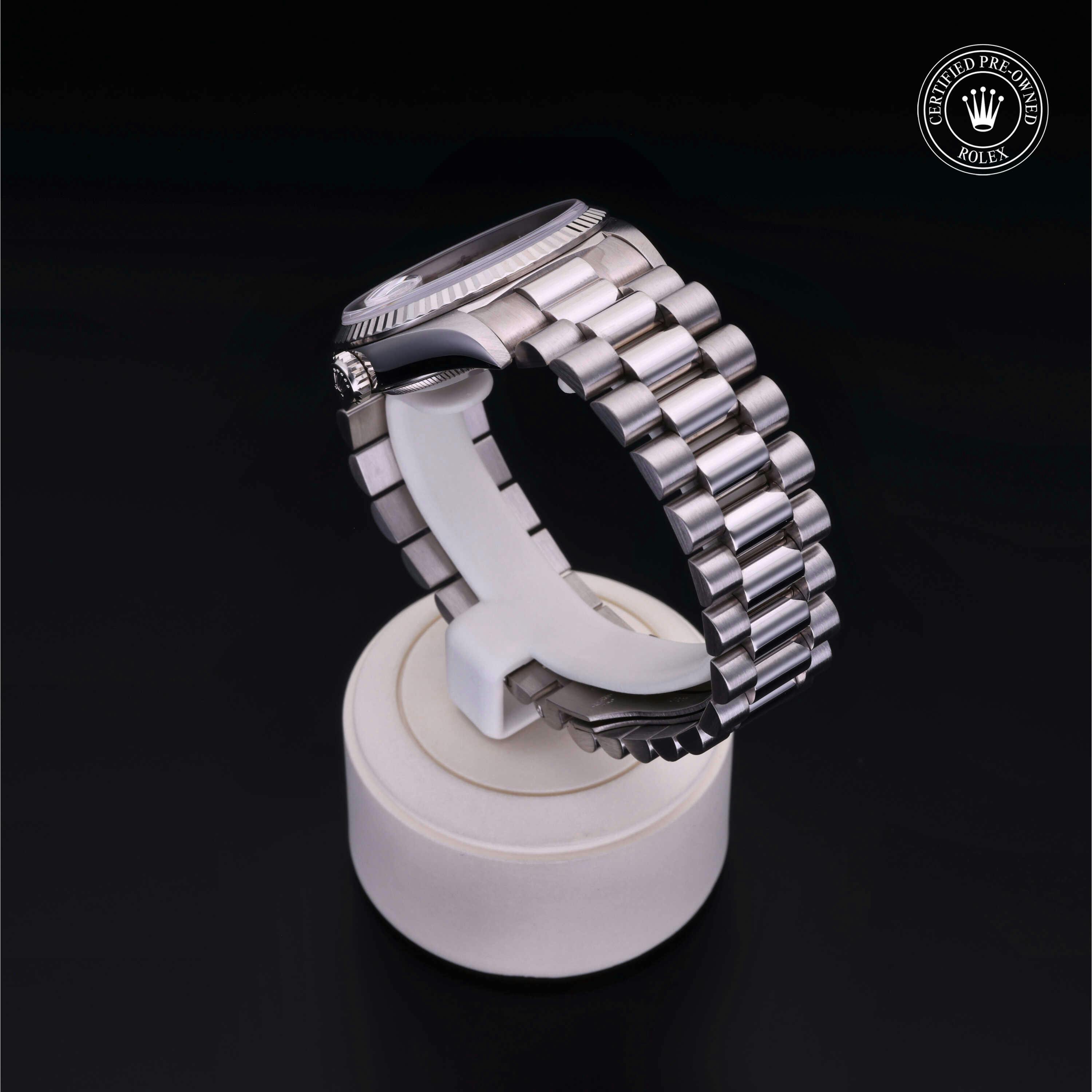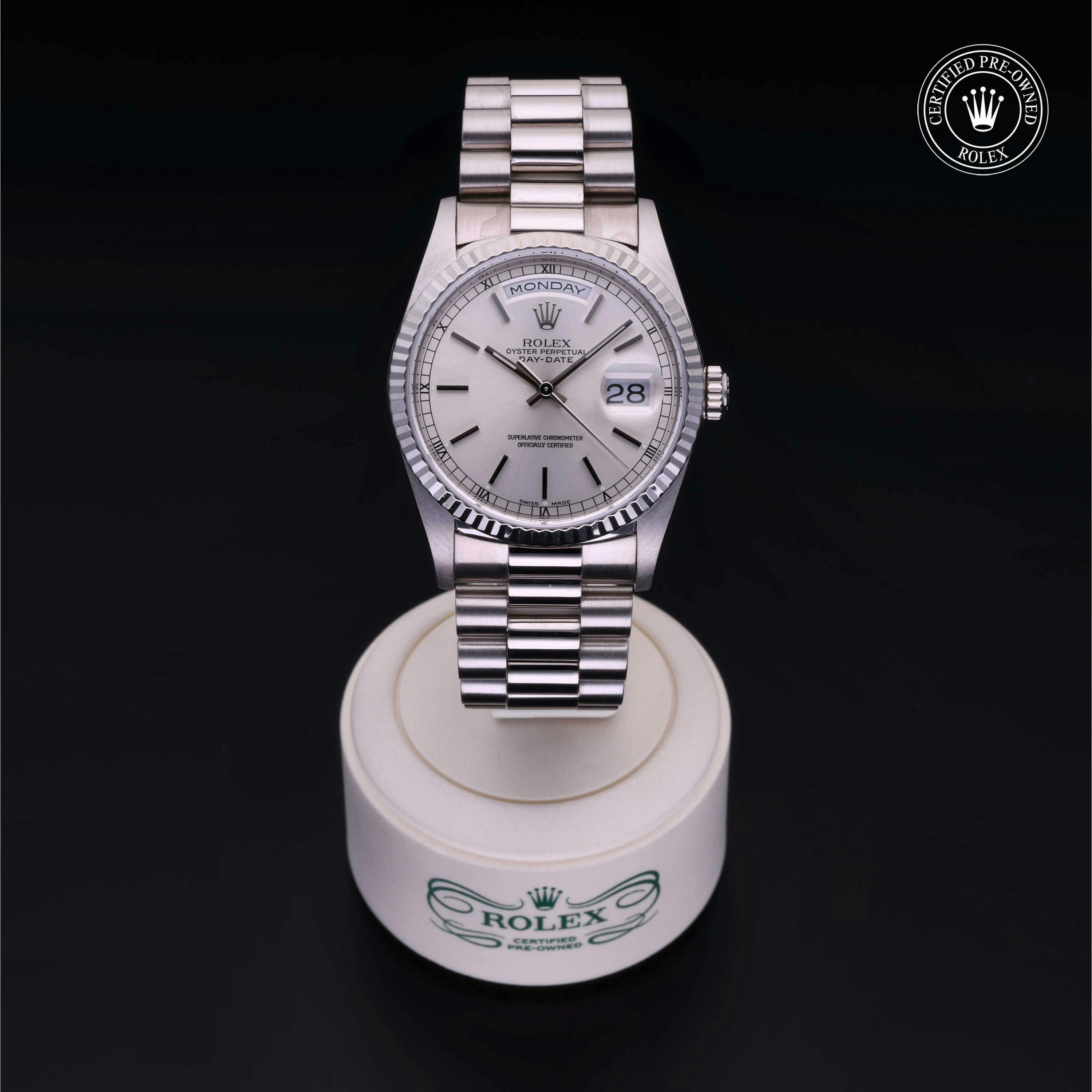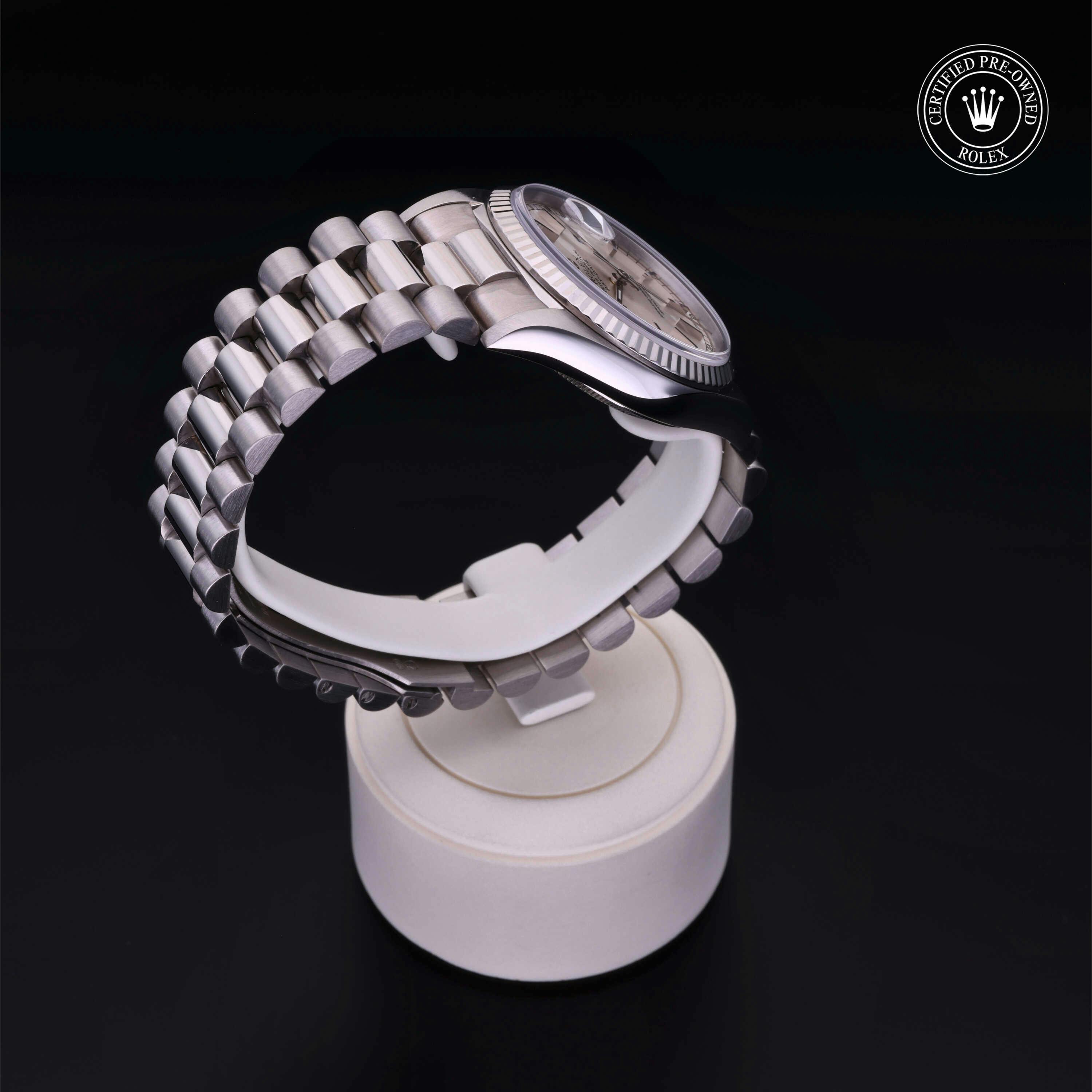 Rolex Certified Pre-Owned Day-Date (18239) self - winding automatic watch, features a 36mm 18k white gold case and fluted bezel surrounding a silver dial on an 18k white gold president bracelet. Functions include hours, minutes, seconds, date and day. This watch has received Rolex-authorized service and certification. It comes with the original box, and includes a custom Rolex Certified Pre-Owned hang tag, travel pouch and RCPO international warranty card.