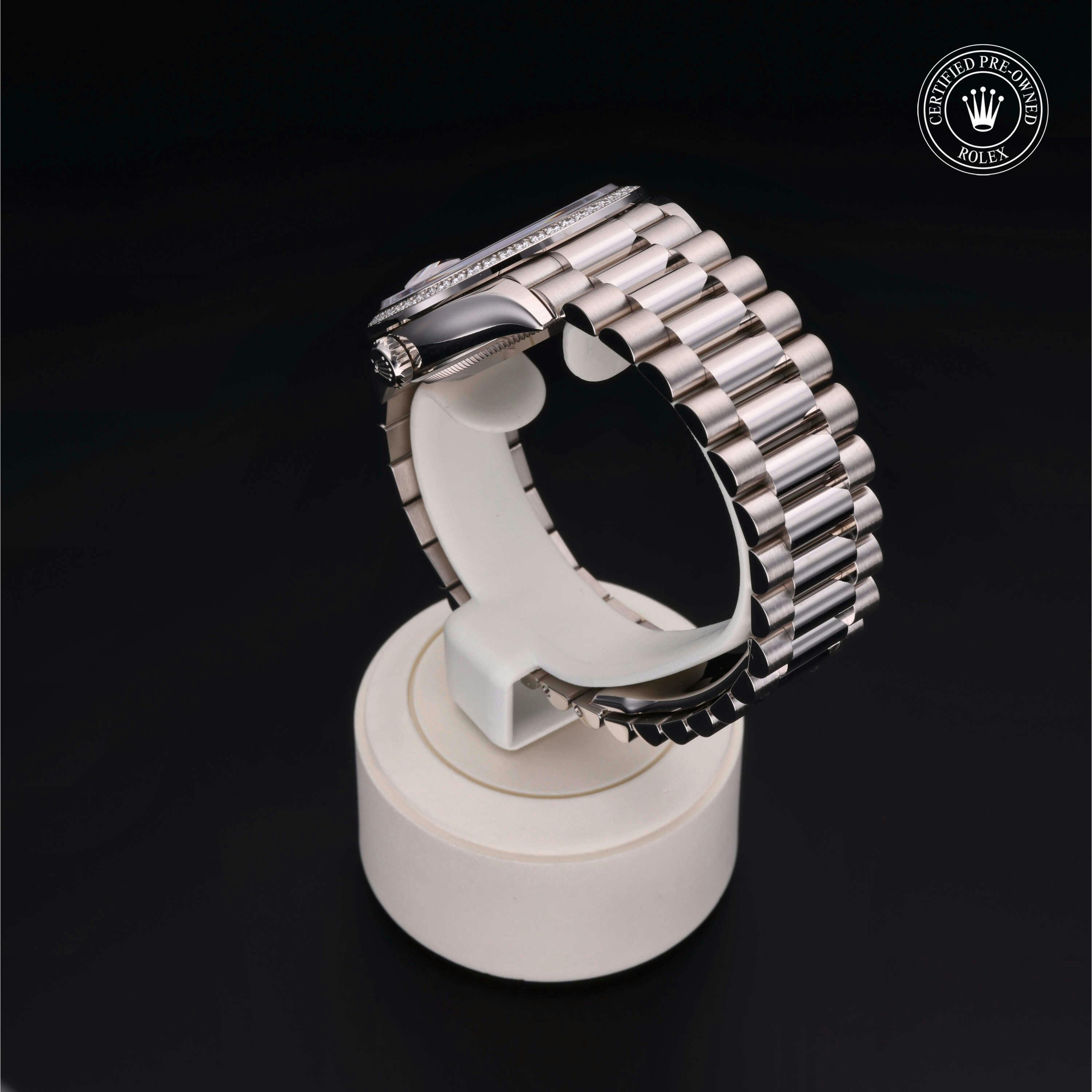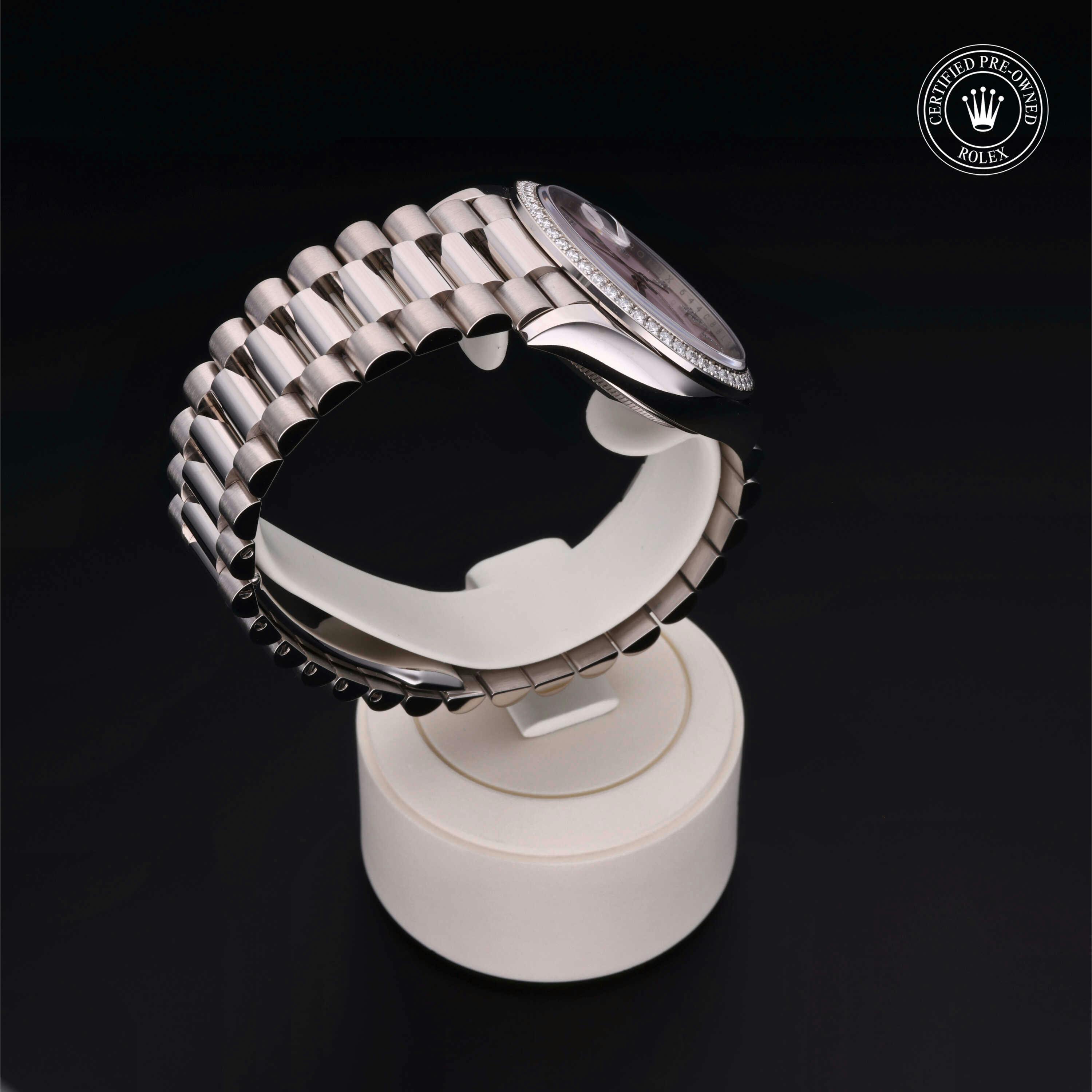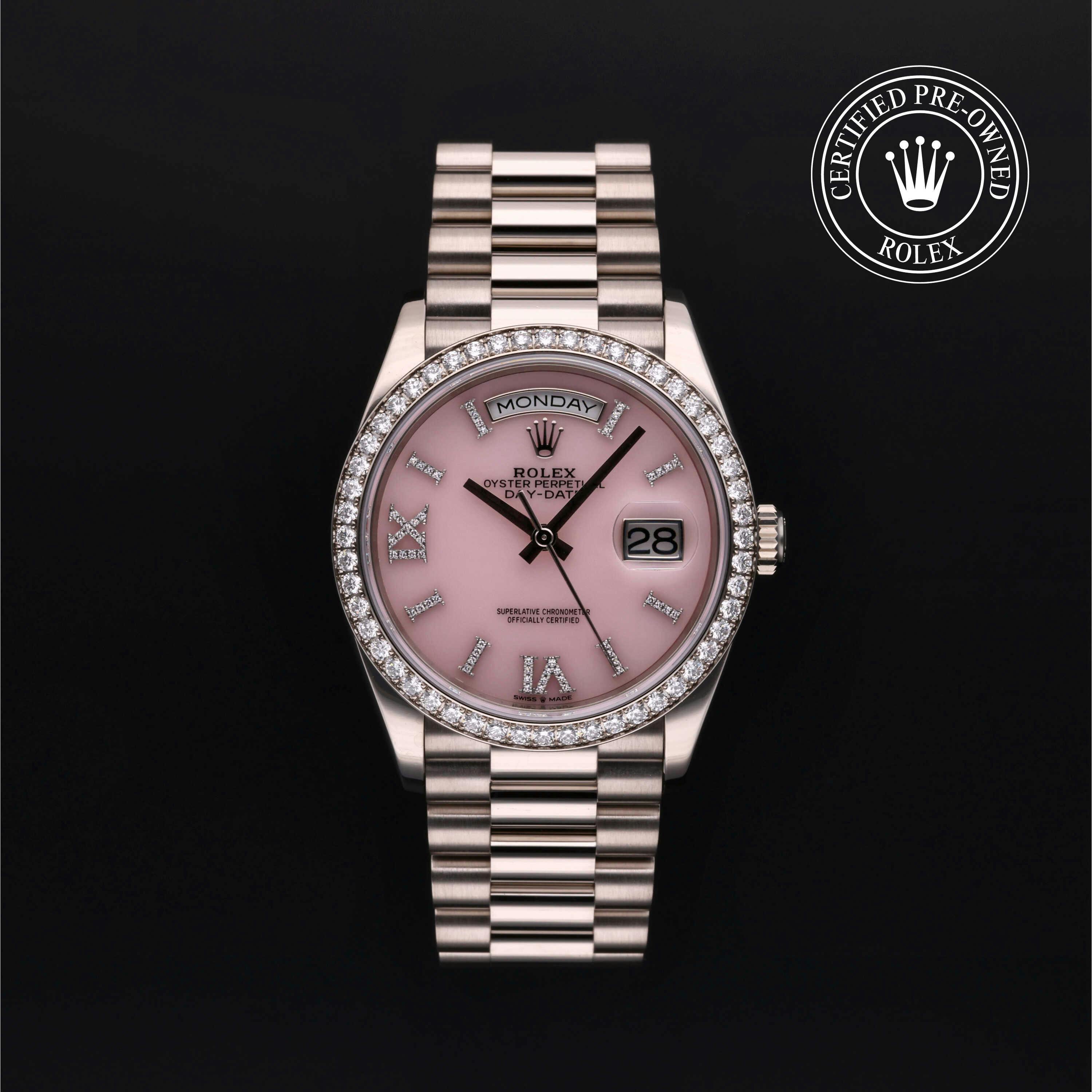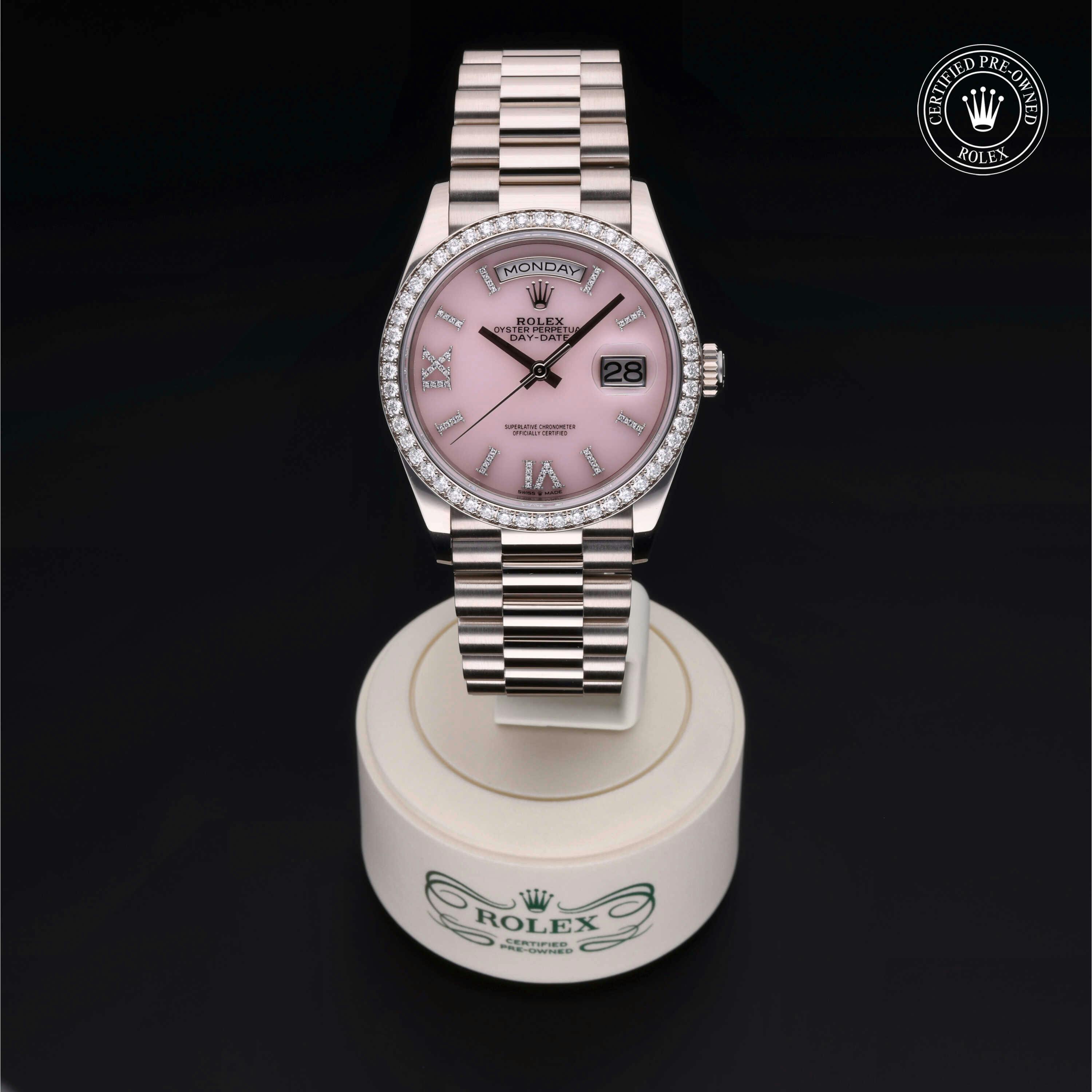 Rolex Certified Pre-Owned Day-Date (128349RBR) self - winding automatic watch, features a 36mm 18k white gold case with a diamond bezel surrounding a pink opal diamond set dial on an 18k white gold president bracelet. Functions include hours, minutes, seconds, date and day. This watch has received Rolex-authorized service and certification. It comes with the original papers, and includes a custom Rolex Certified Pre-Owned hang tag, travel pouch and RCPO international warranty card.