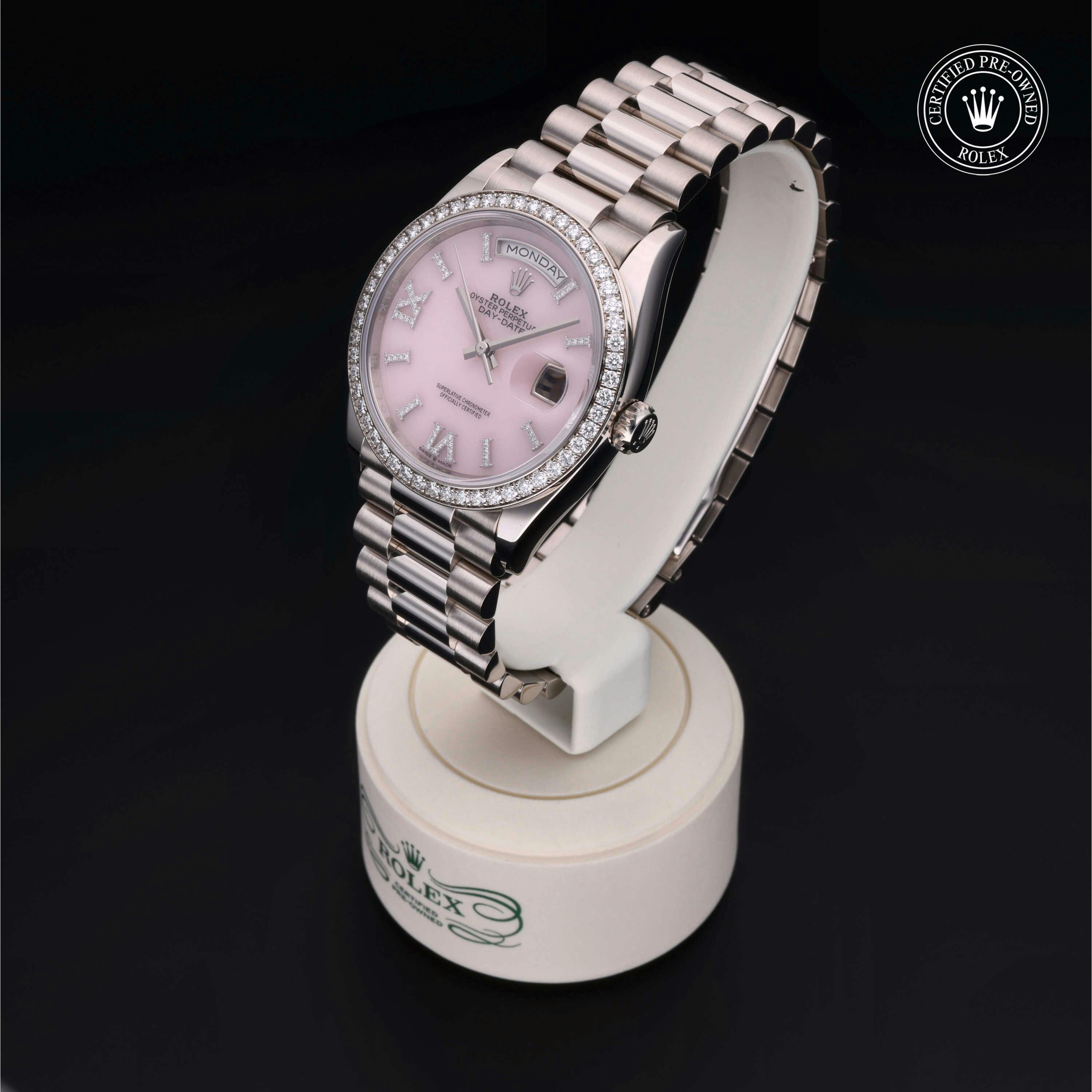 Rolex Certified Pre-Owned Day-Date (128349RBR) self - winding automatic watch, features a 36mm 18k white gold case with a diamond bezel surrounding a pink opal diamond set dial on an 18k white gold president bracelet. Functions include hours, minutes, seconds, date and day. This watch has received Rolex-authorized service and certification. It comes with the original papers, and includes a custom Rolex Certified Pre-Owned hang tag, travel pouch and RCPO international warranty card.