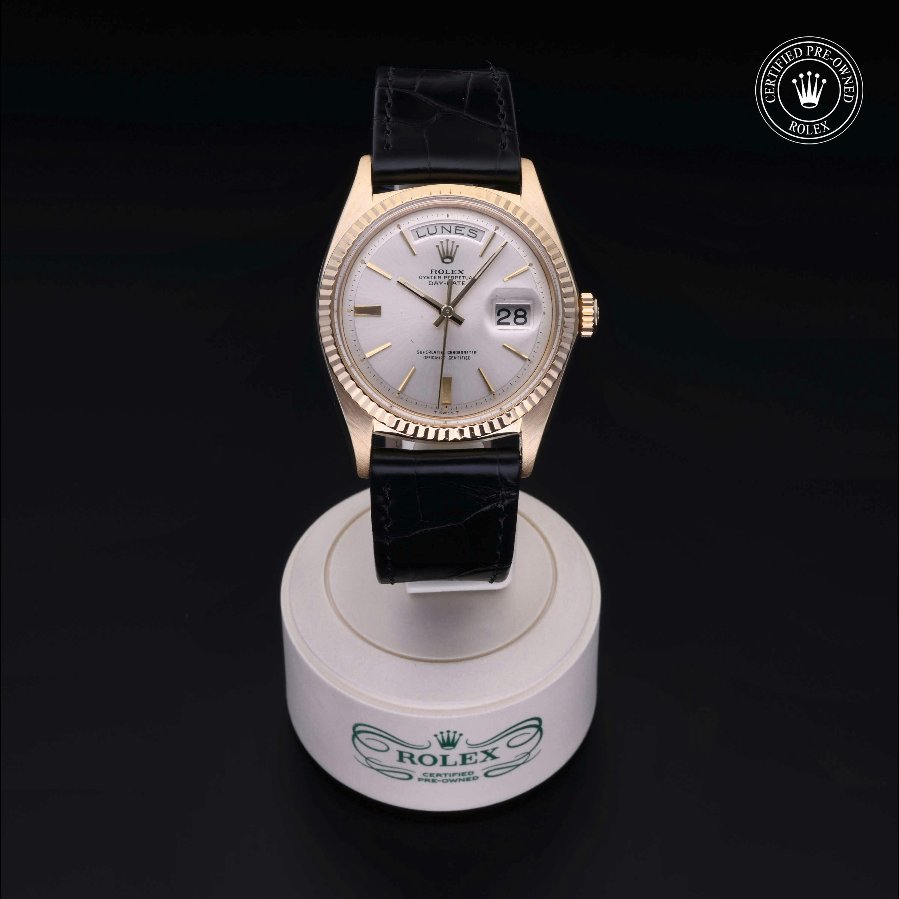 Rolex Certified Pre-Owned Day-Date (1803) self - winding automatic watch, features a 36mm 18k yellow gold case and fluted bezel surrounding a silver dial on a black alligator strap with an 18k yellow gold tang buckle. Functions include hours, minutes, seconds, date and day. This watch has received Rolex-authorized service and certification. It does not come with the original box or papers, but includes a custom Rolex Certified Pre-Owned hang tag, travel pouch and RCPO international warranty card.