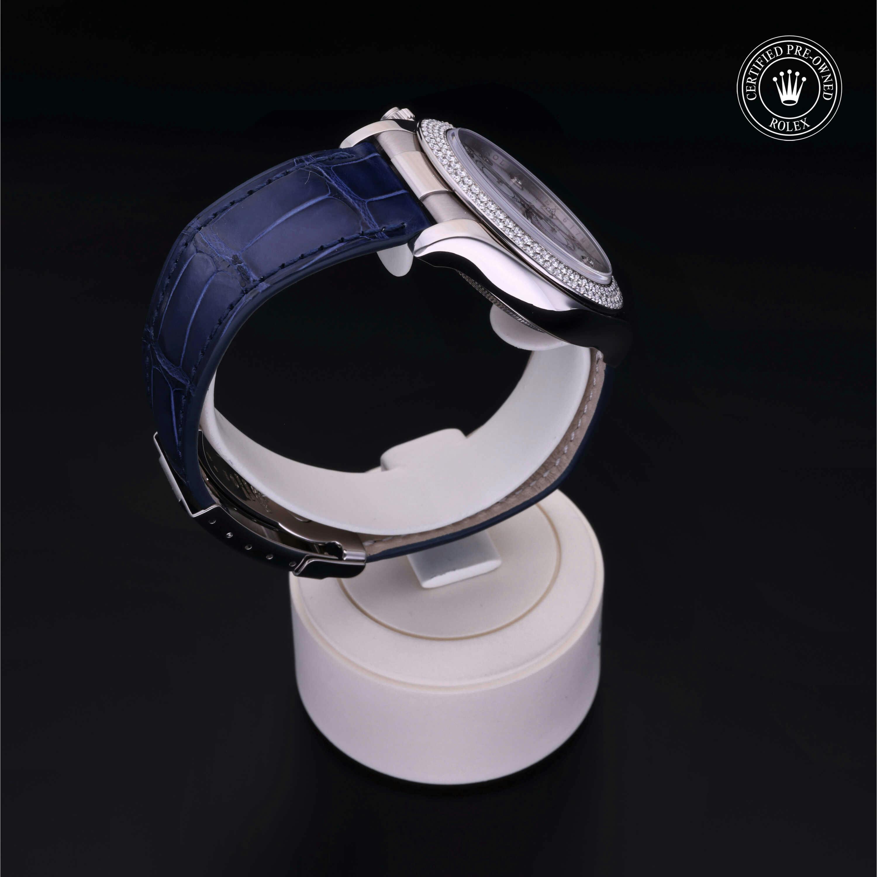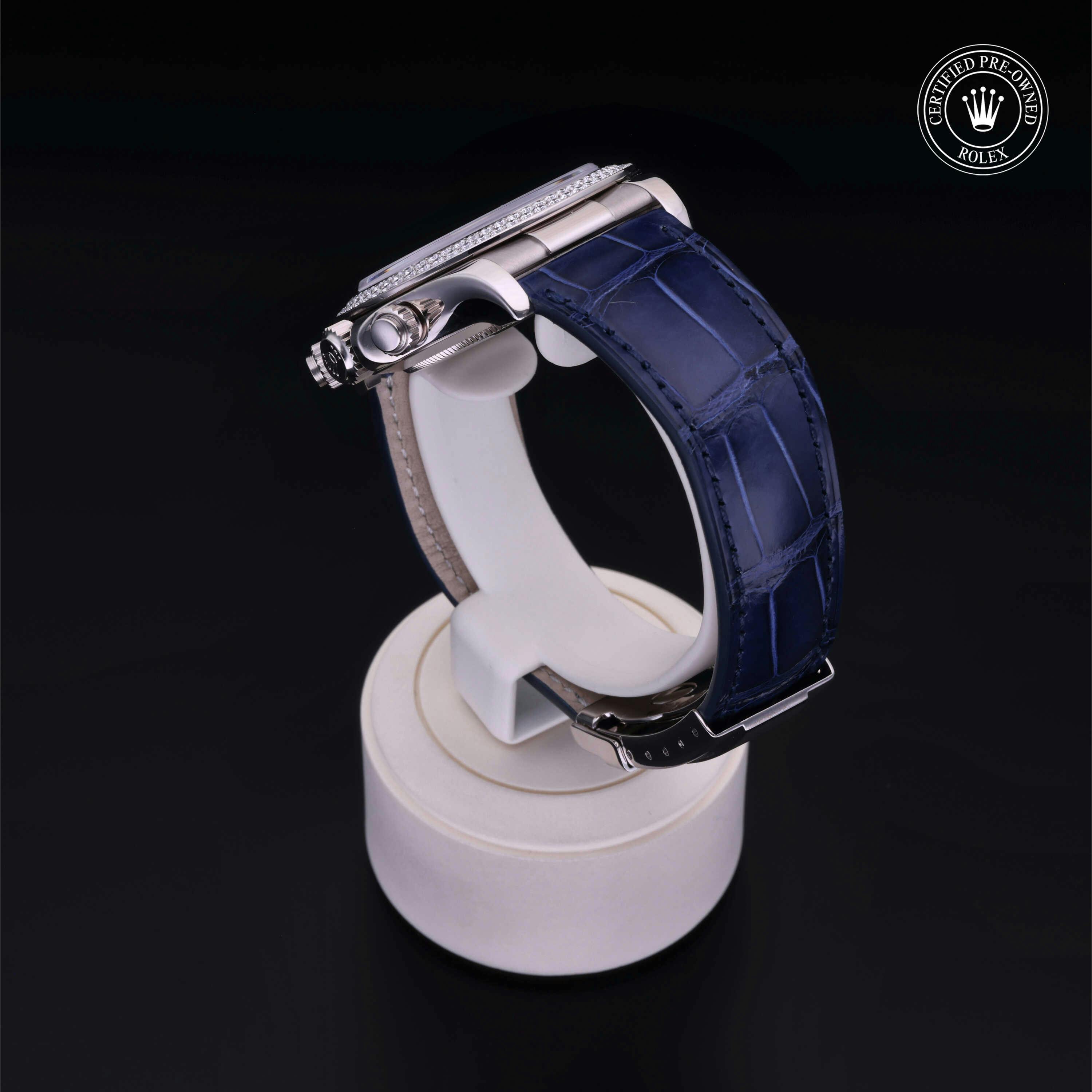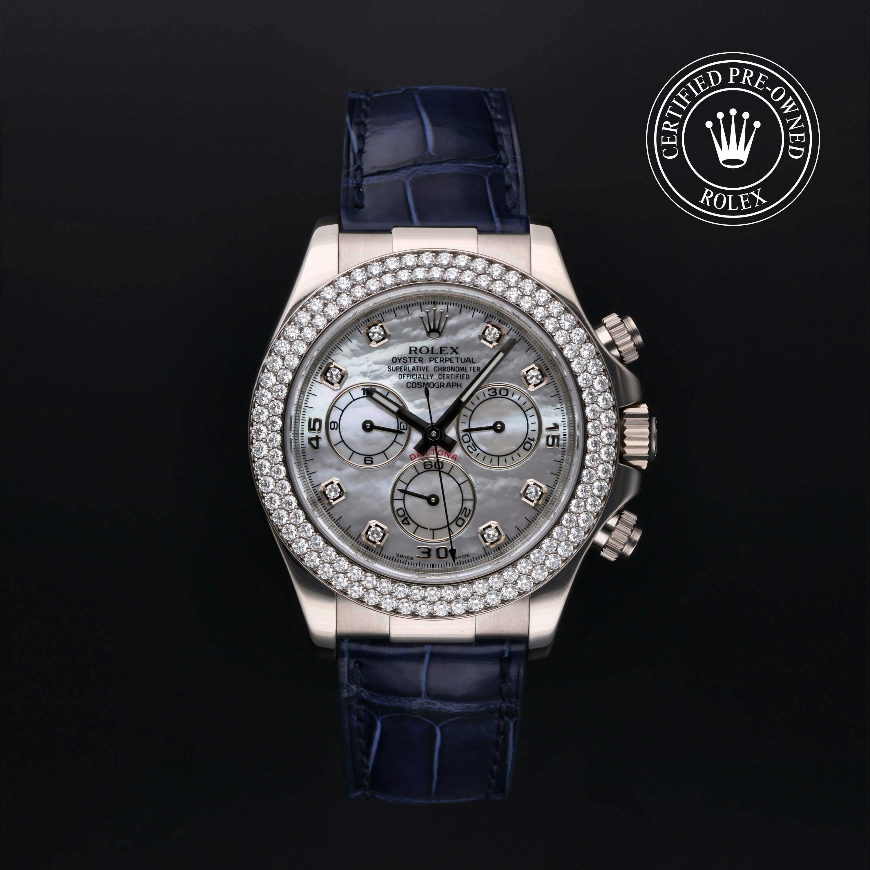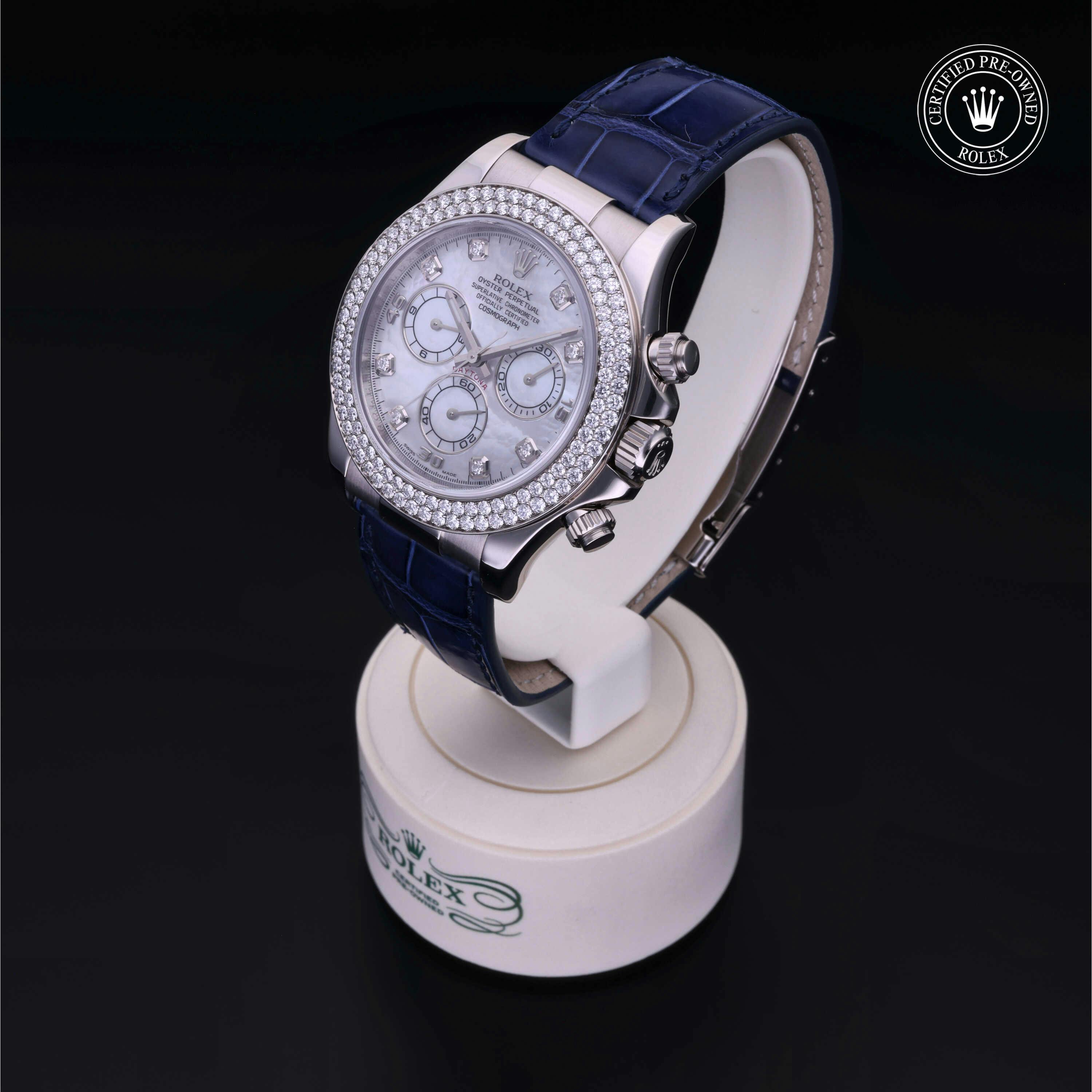 Rolex Certified Pre-Owned Cosmograph Daytona (116589) self - winding automatic watch, features a 40mm 18k white gold case with a diamond set bezel surrounding a white, mother of pearl diamond set dial on a blue alligator strap with an 18k white gold deployant buckle. Functions include hours, minutes, seconds and chronograph. This watch has received Rolex-authorized service and certification. It comes with the original papers, and includes a custom Rolex Certified Pre-Owned hang tag, travel pouch and RCPO international warranty card.