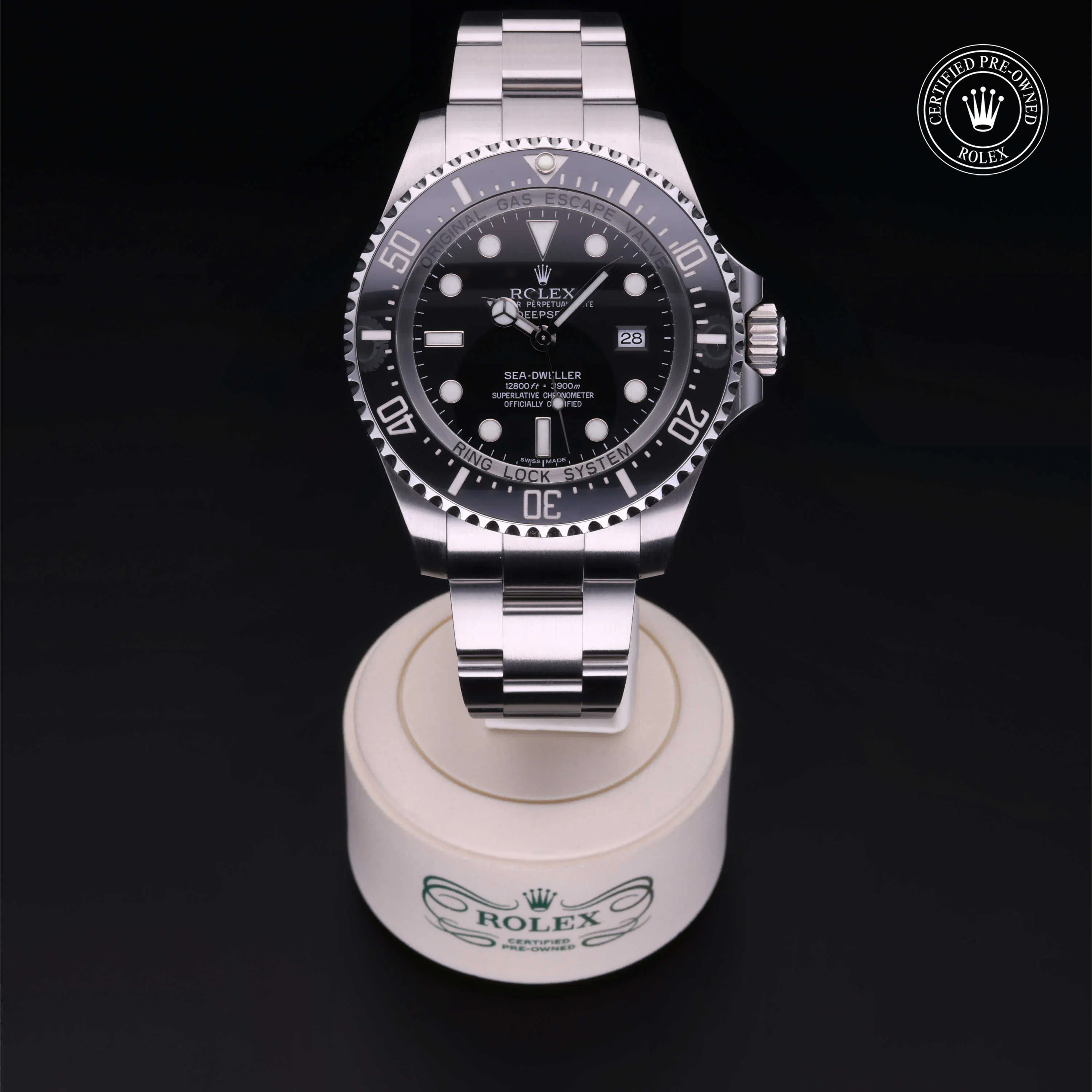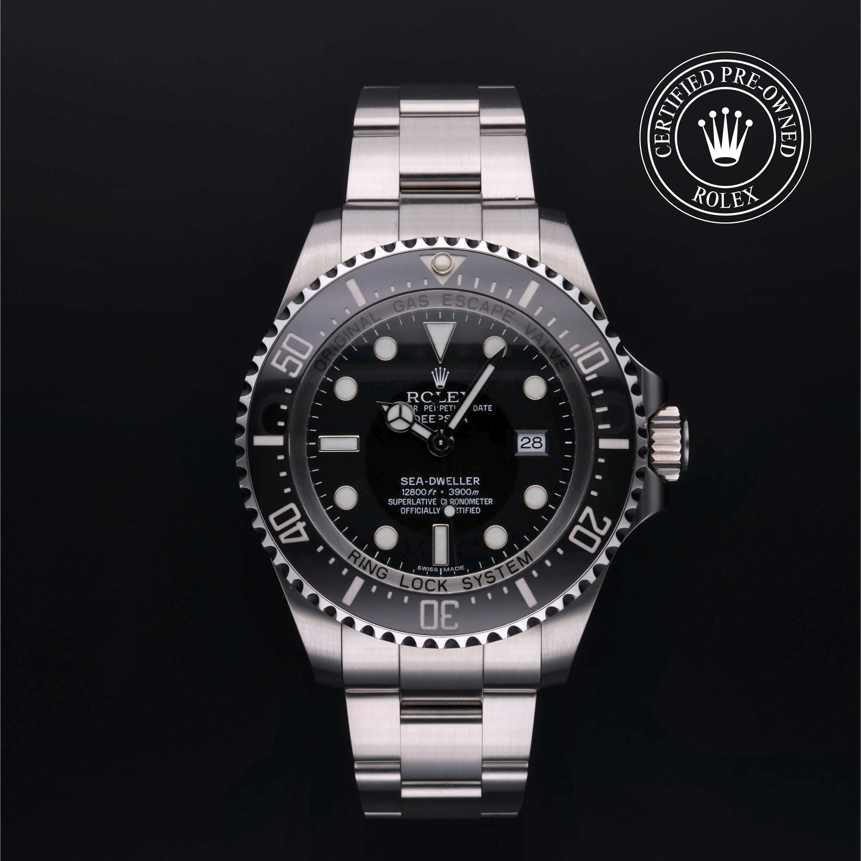 Rolex Certified Pre-Owned Sea-Dweller Deepsea (116660) self - winding automatic watch, features a 44mm stainless steel case with a stainless steel and black cerachrom unidirectional rotating bezel surrounding a black dial. Watch is secured on a stainless steel Oyster bracelet complete with a folding buckle. Functions include hours, minutes, seconds, date and helium release valve. This watch has received Rolex-authorized service and certified by Rolex. It comes with the original box and papers, and includes a custom Rolex Certified Pre-Owned hang tag, travel pouch and international warranty card.