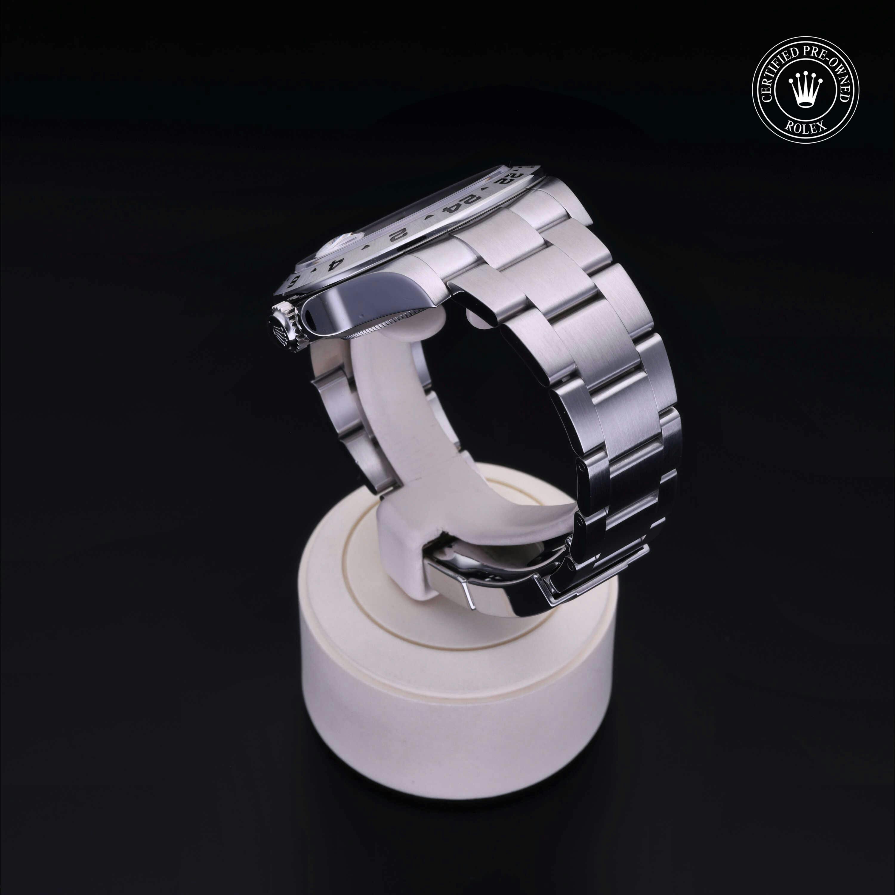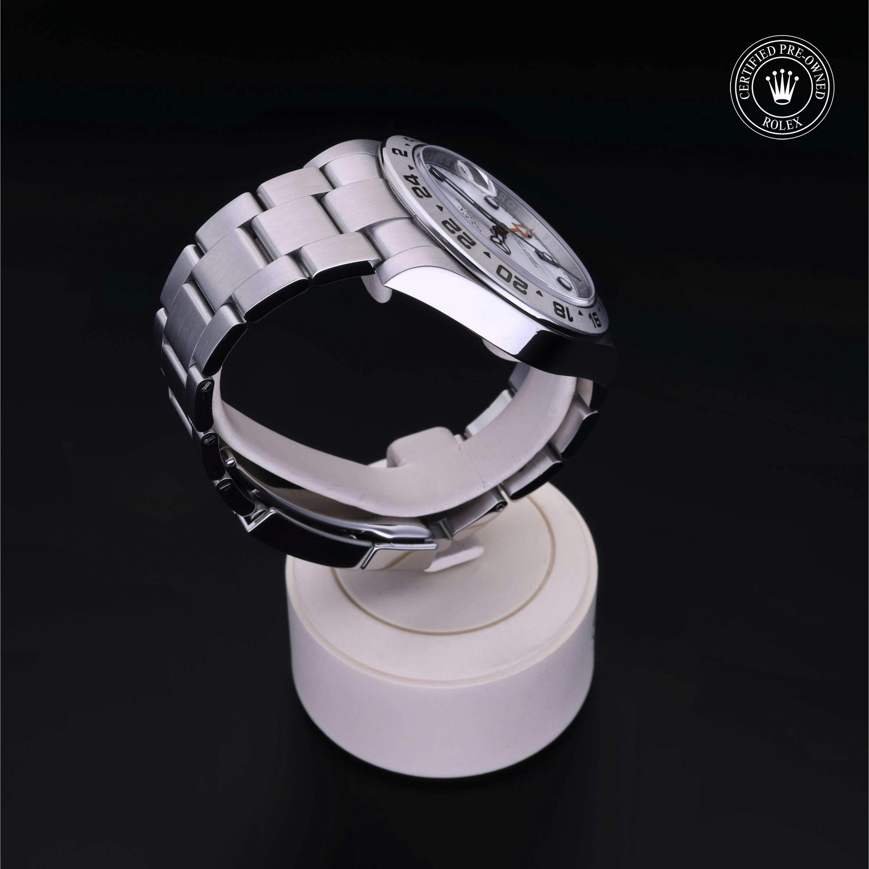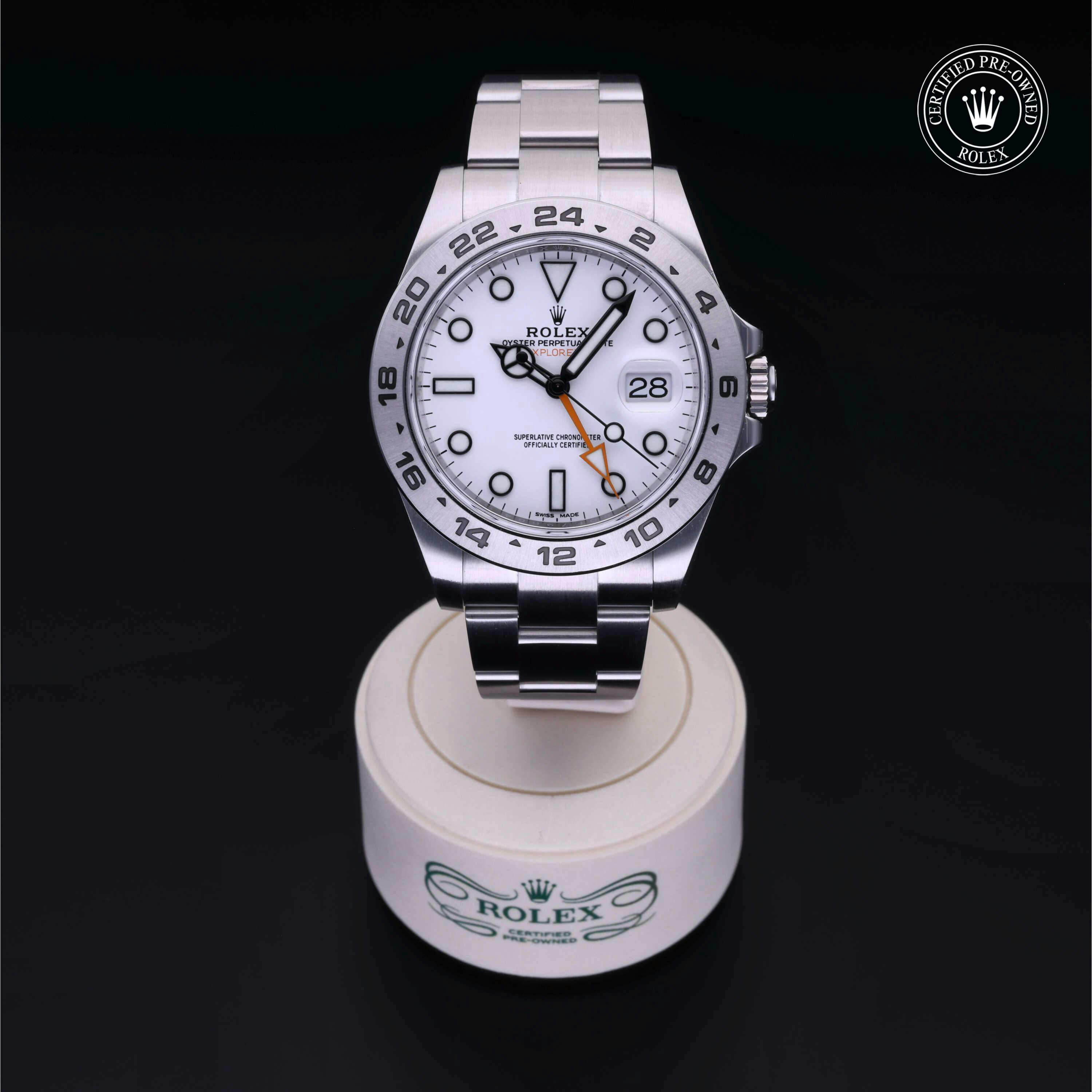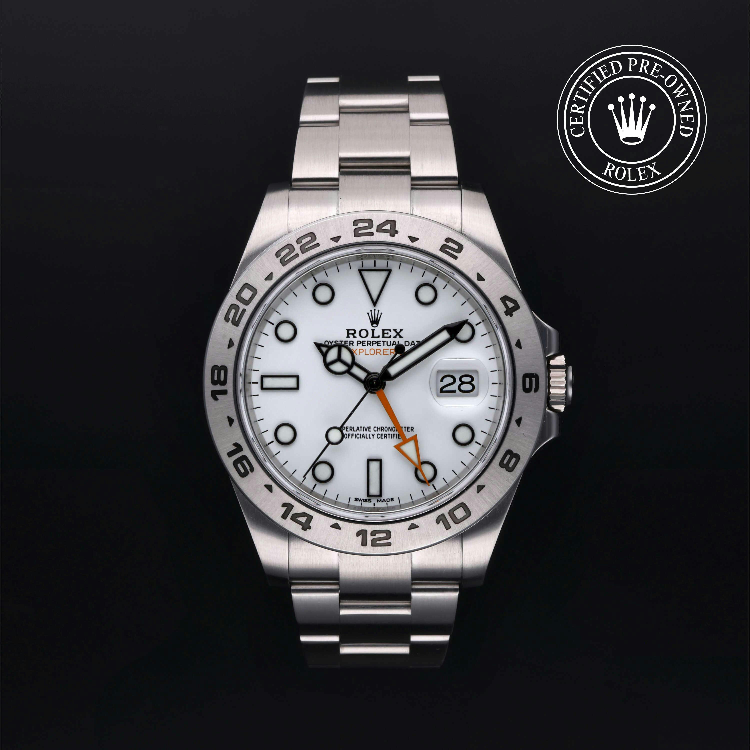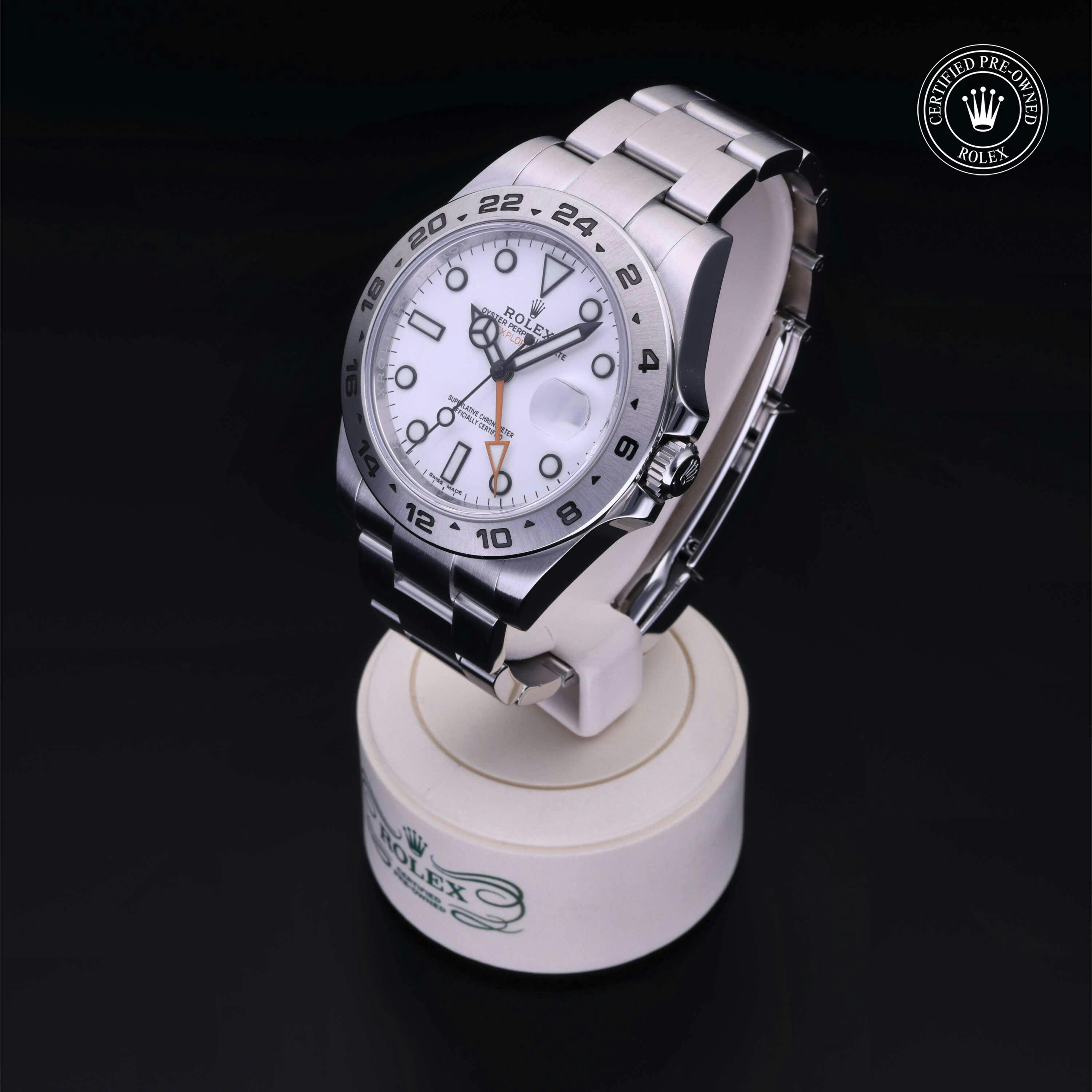 Rolex Certified Pre-Owned Explorer II (216570) self - winding automatic watch, features a 42mm stainless steel case and fixed bezel surrounding a white dial on a stainless steel oyster bracelet. Functions include hours, minutes, seconds date and gmt/world time. This watch has received Rolex-authorized service and certification. It comes with the original papers, and includes a custom Rolex Certified Pre-Owned hang tag, travel pouch and RCPO international warranty card.