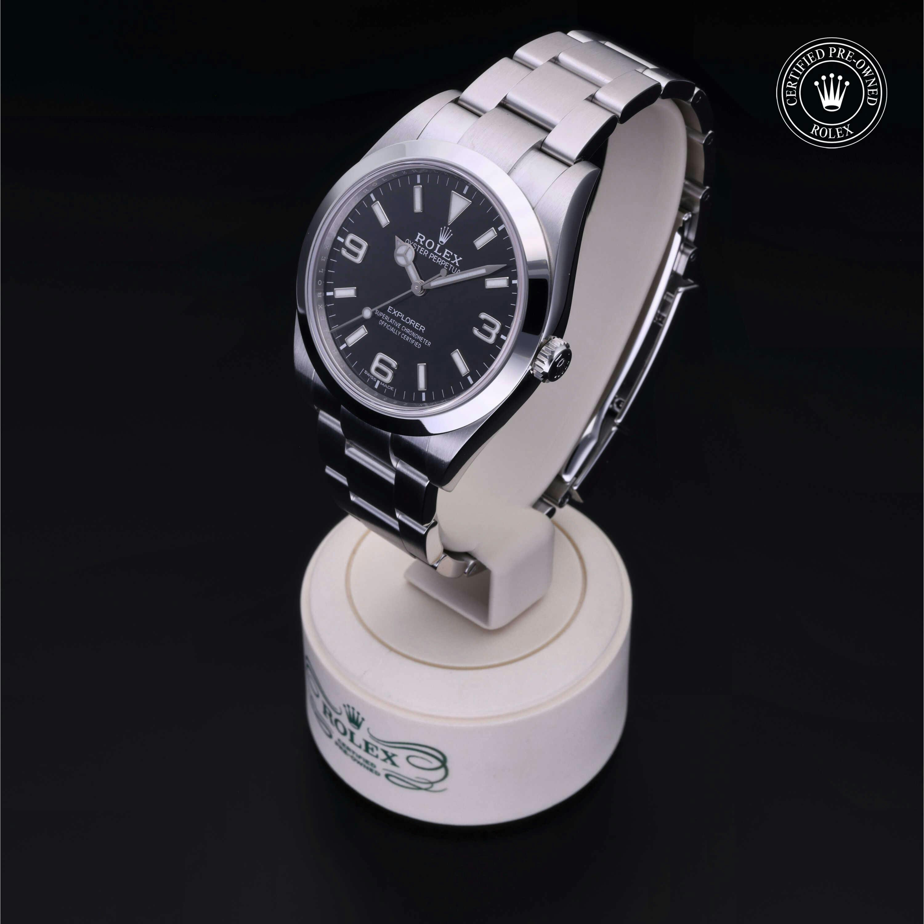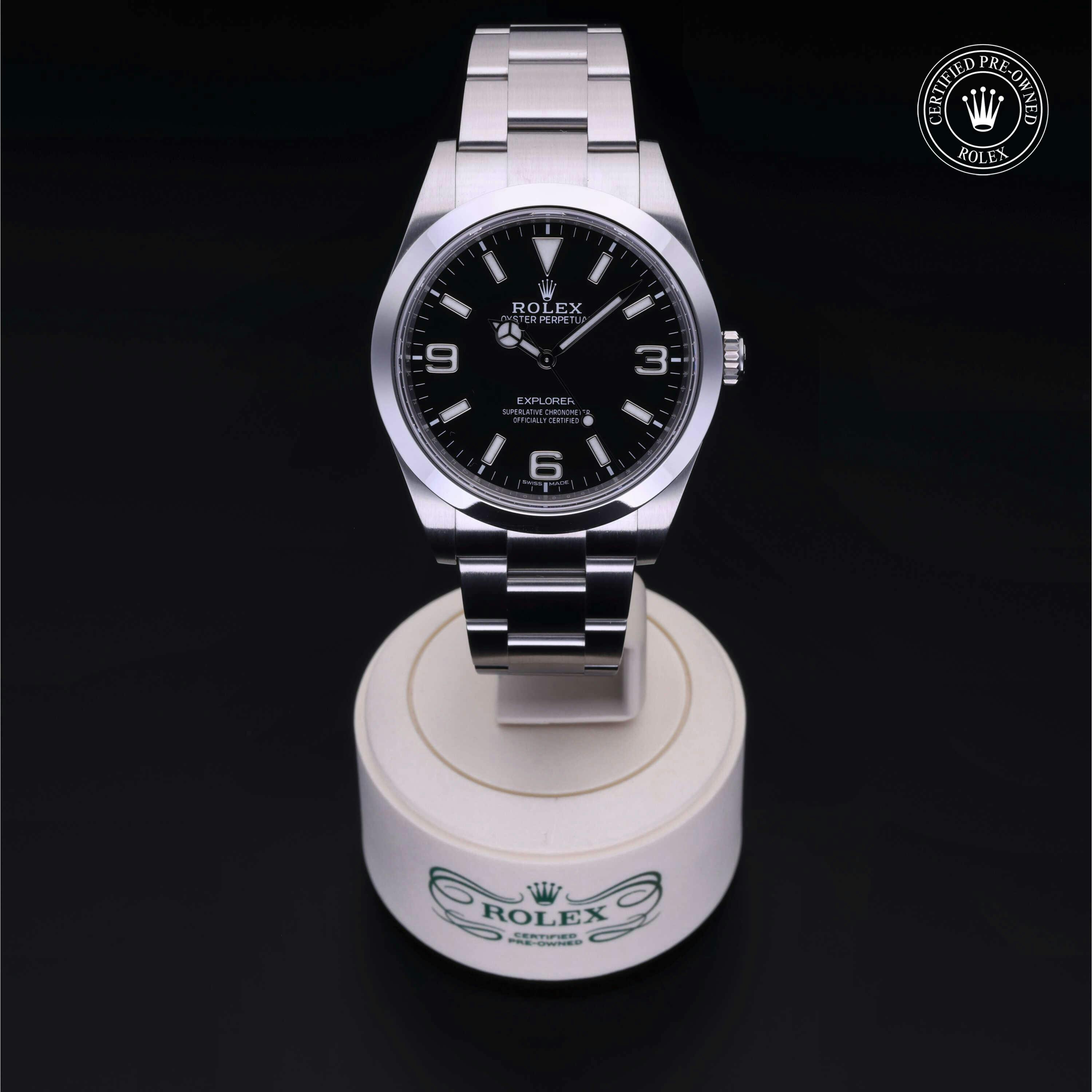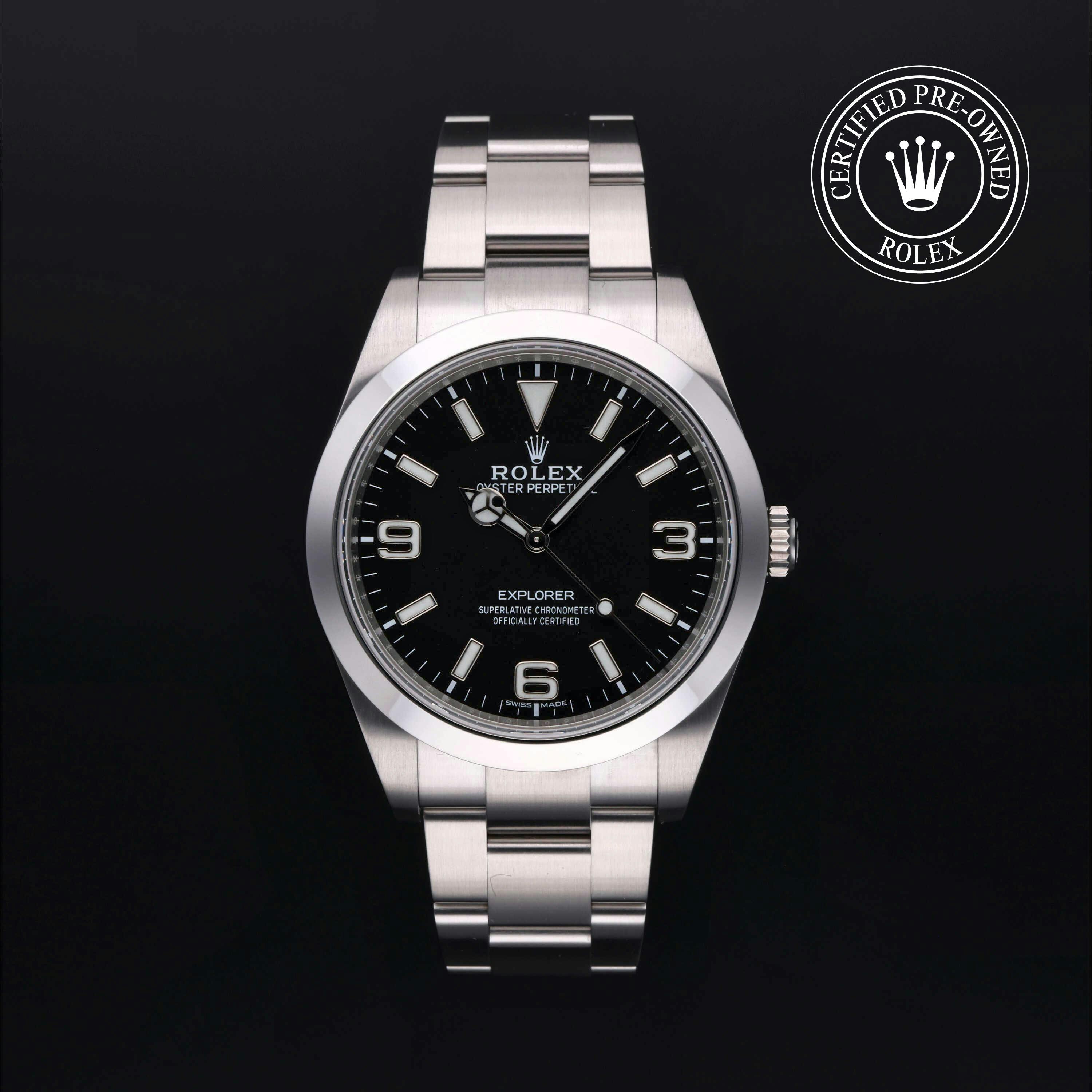 Rolex Certified Pre-Owned Explorer (214270) self - winding automatic watch, features a 39mm stainless steel case and smooth bezel surrounding a black dial on a stainless steel oyster bracelet. Functions include hours, minutes and seconds. This watch has received Rolex-authorized service and certification. It comes with the original box and papers, and includes a custom Rolex Certified Pre-Owned hang tag, travel pouch and RCPO international warranty card.