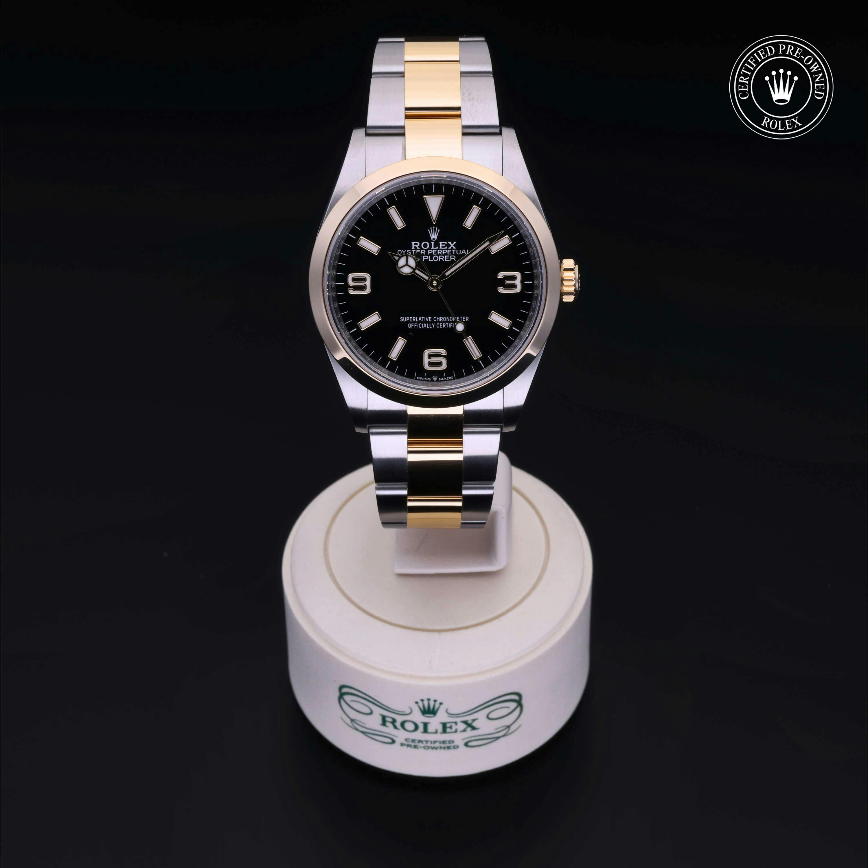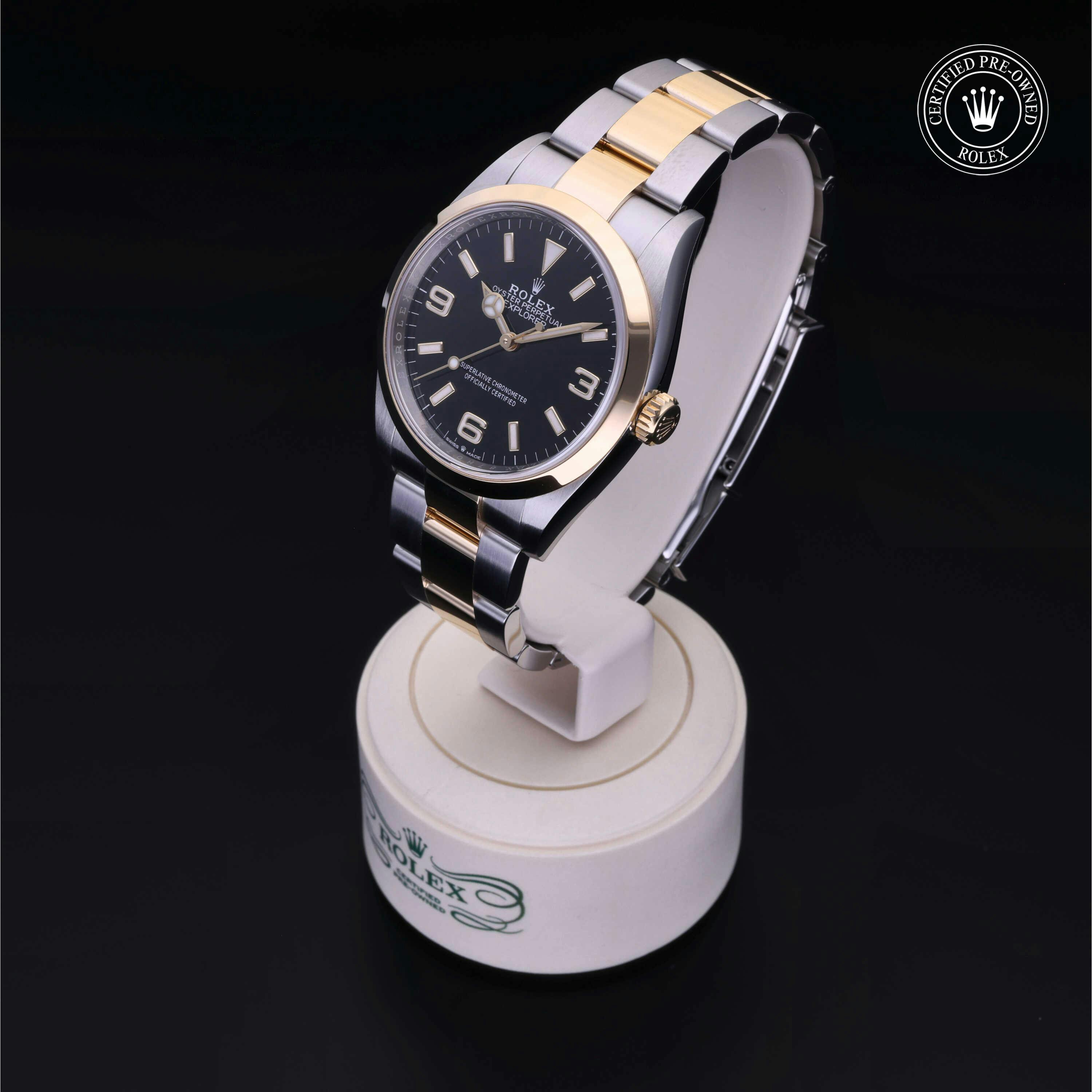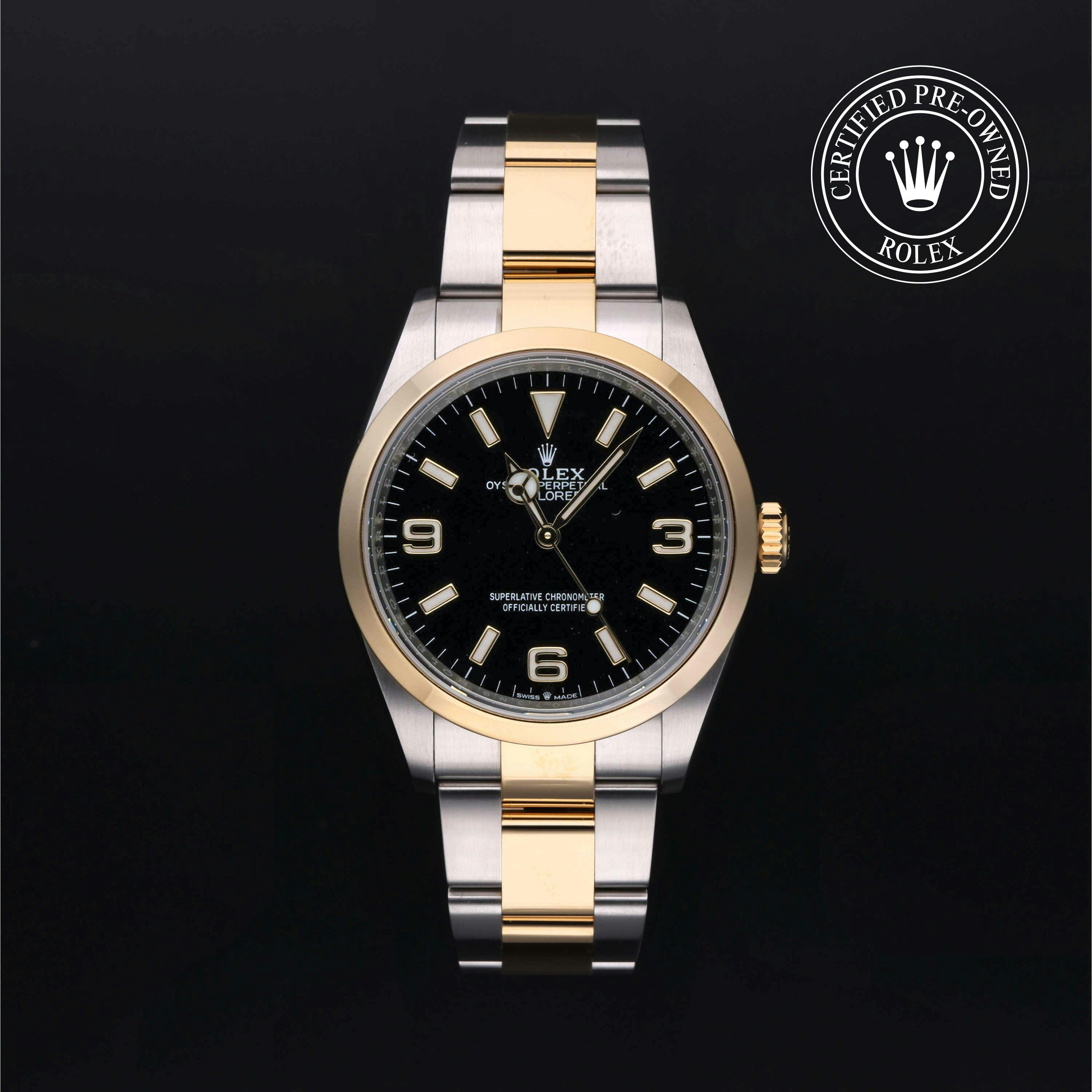Rolex Certified Pre-Owned Explorer (124273) self - winding automatic watch, features a 36mm stainless steel case with an 18k yellow gold smooth bezel surrounding a black dial on a stainless steel and 18k yellow gold oyster bracelet. Functions include hours, minutes and seconds. This watch has received Rolex-authorized service and certification. It comes with the original box and papers, and includes a custom Rolex Certified Pre-Owned hang tag, travel pouch and RCPO international warranty card.