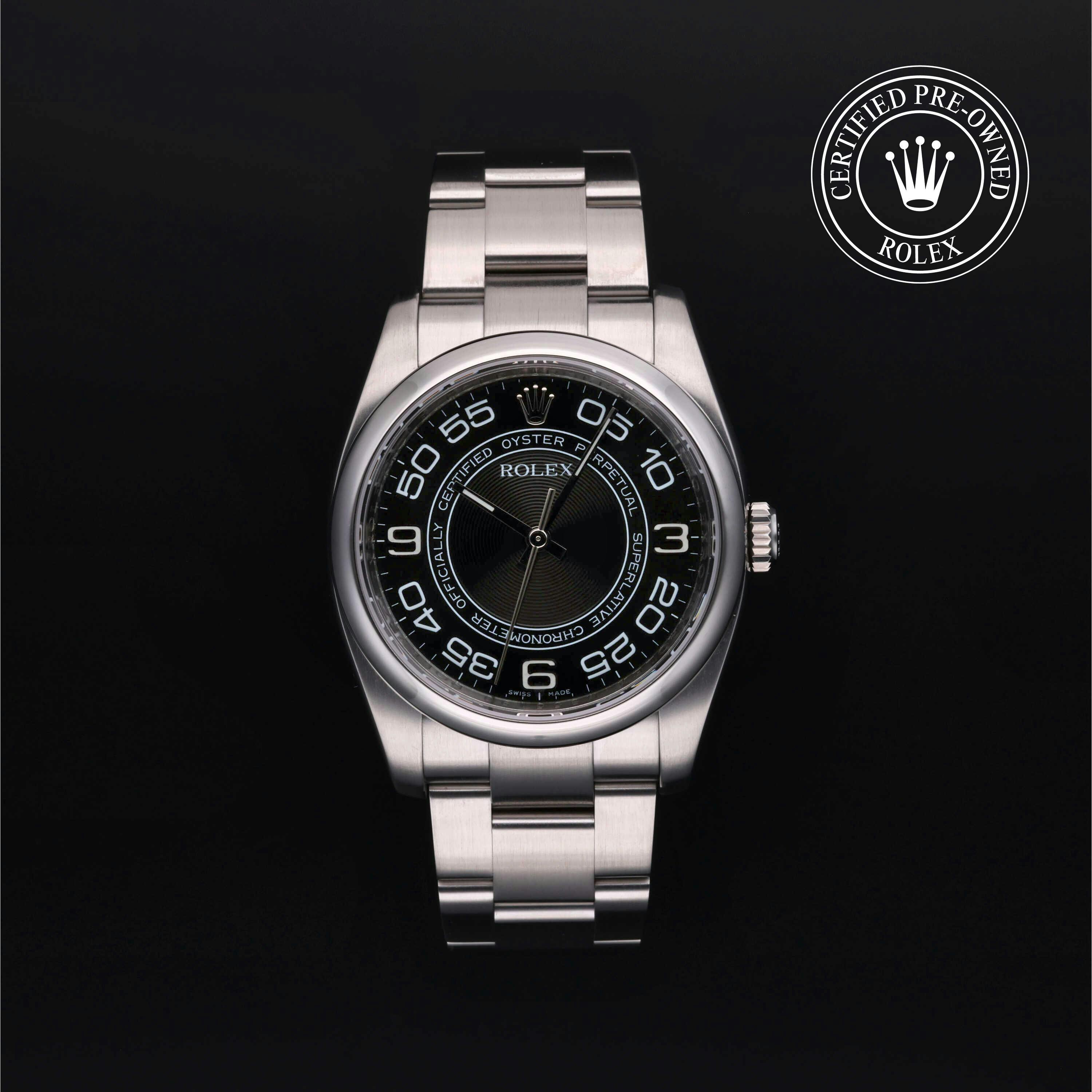 This 39mm stainless steel Oyster Perpetual features a clean white dial and 100m waterproofness. It appeals to collectors looking for a discontinued size with modern proportions and understated elegance in a used Rolex Oyster Perpetual.