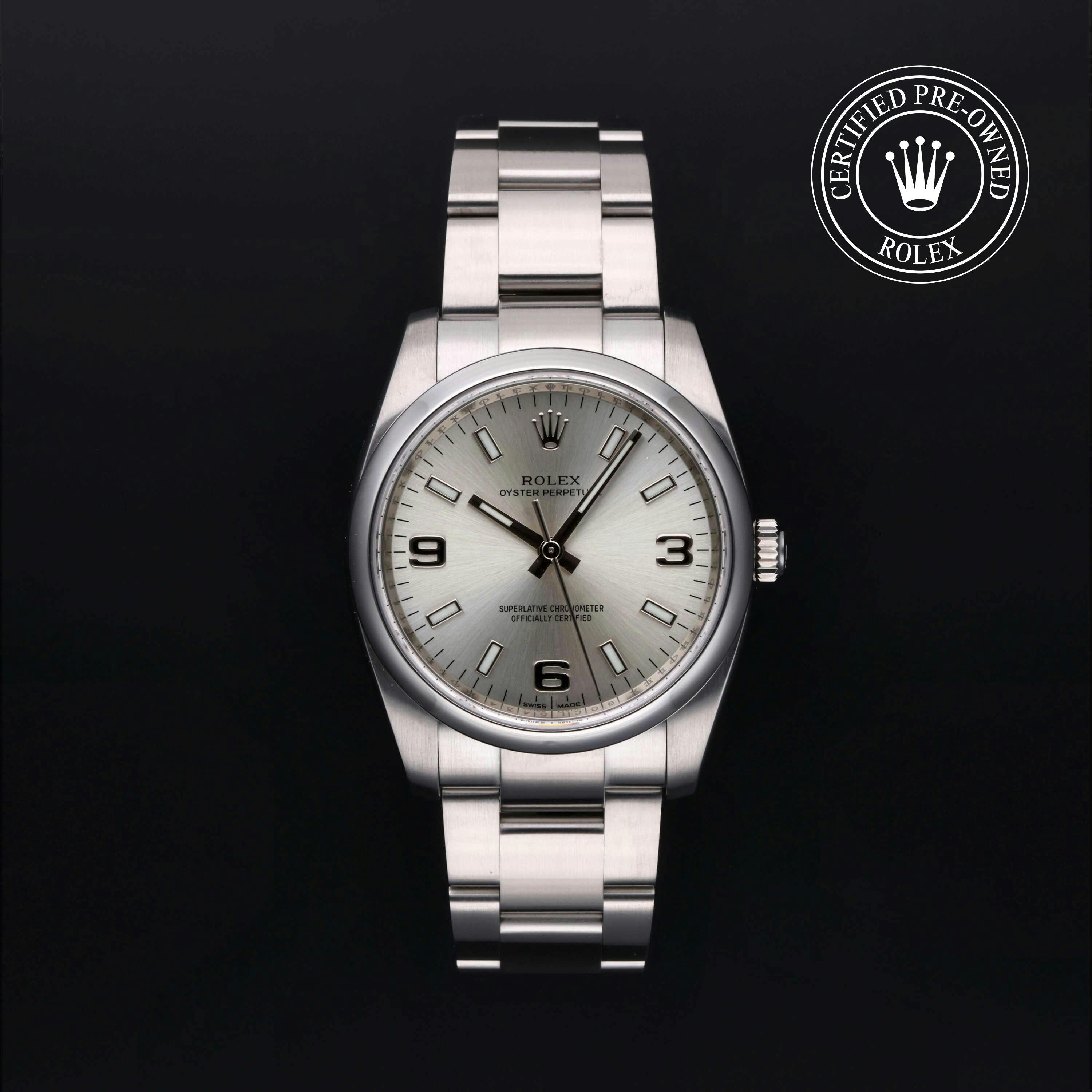Sleek and striking, this silver dial Oyster Perpetual features a 34mm stainless steel case and the iconic 3-6-9 Explorer-style hour markers. It remains a favorite for those seeking used mid-size Rolex watches.