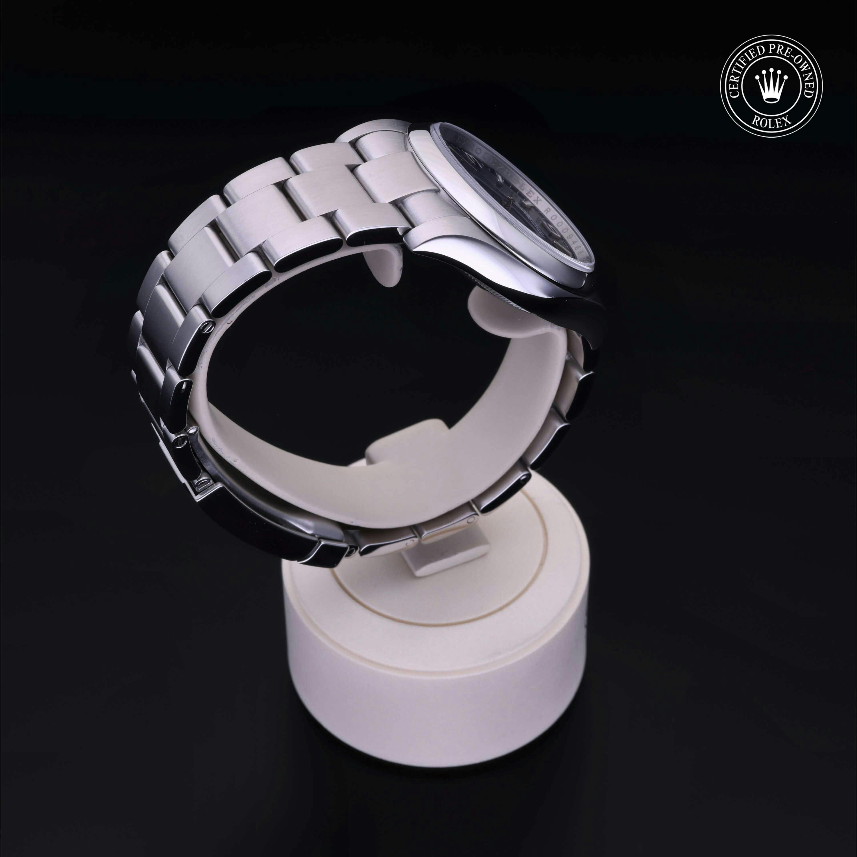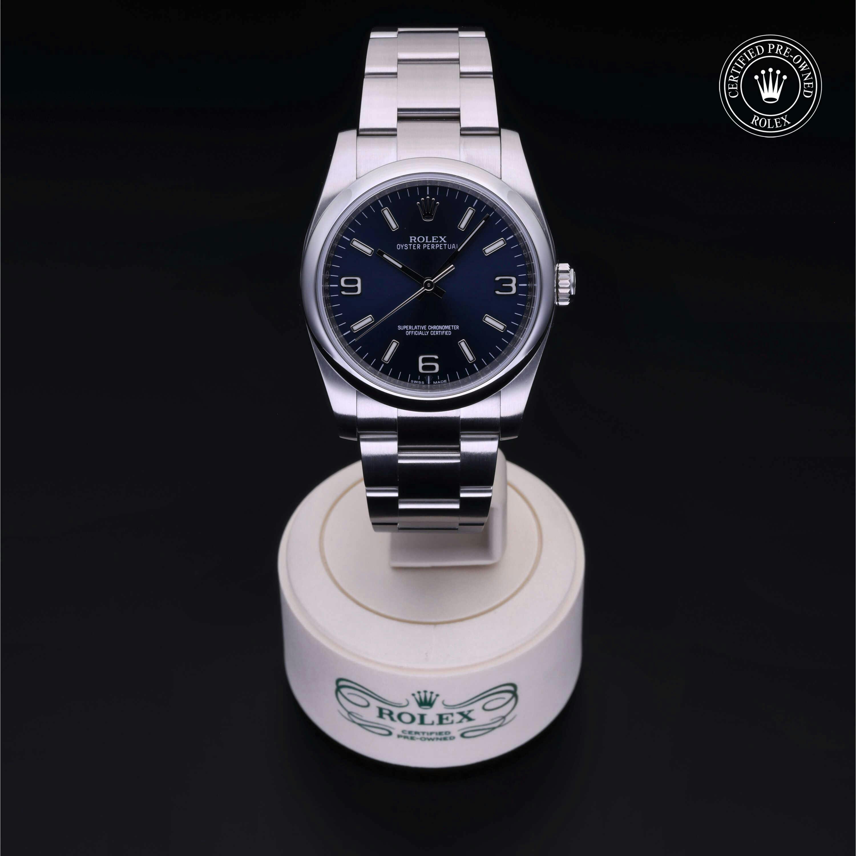 Rolex Certified Pre-Owned Oyster Perpetual (116000) self - winding automatic watch, features a 36mm stainless steel case and domed bezel surrounding a blue dial on a stainless steel oyster bracelet. Functions include hours, minutes and seconds. This watch has received Rolex-authorized service and certification. It does not come with the original box or papers, but includes a custom Rolex Certified Pre-Owned hang tag, travel pouch and RCPO international warranty card.