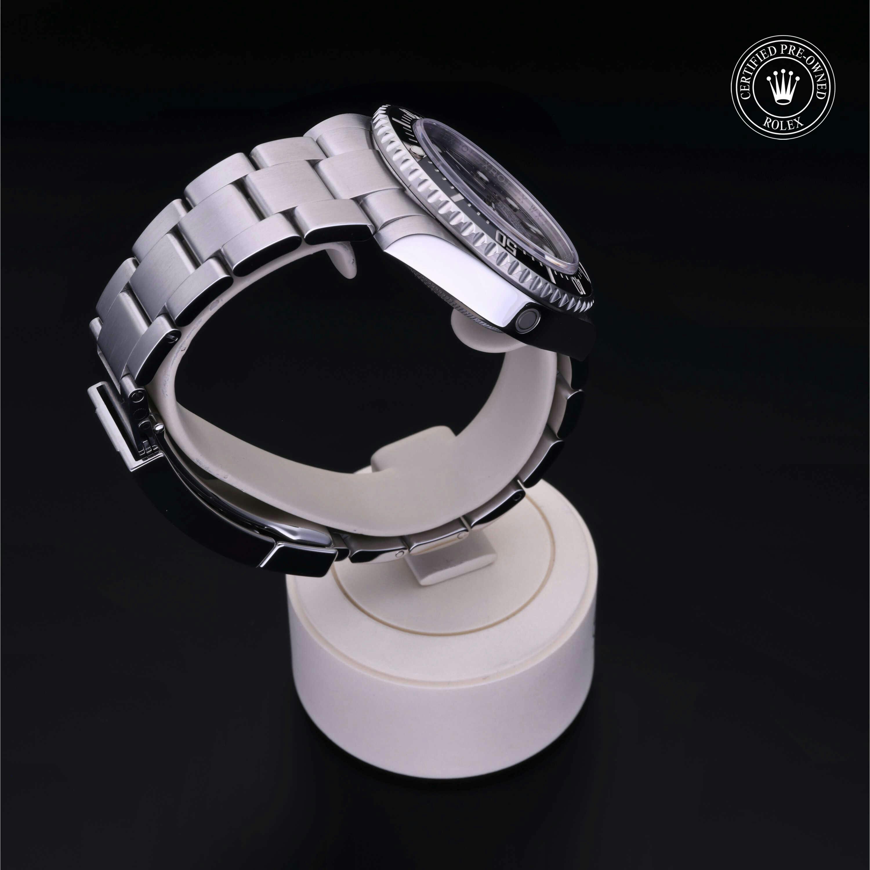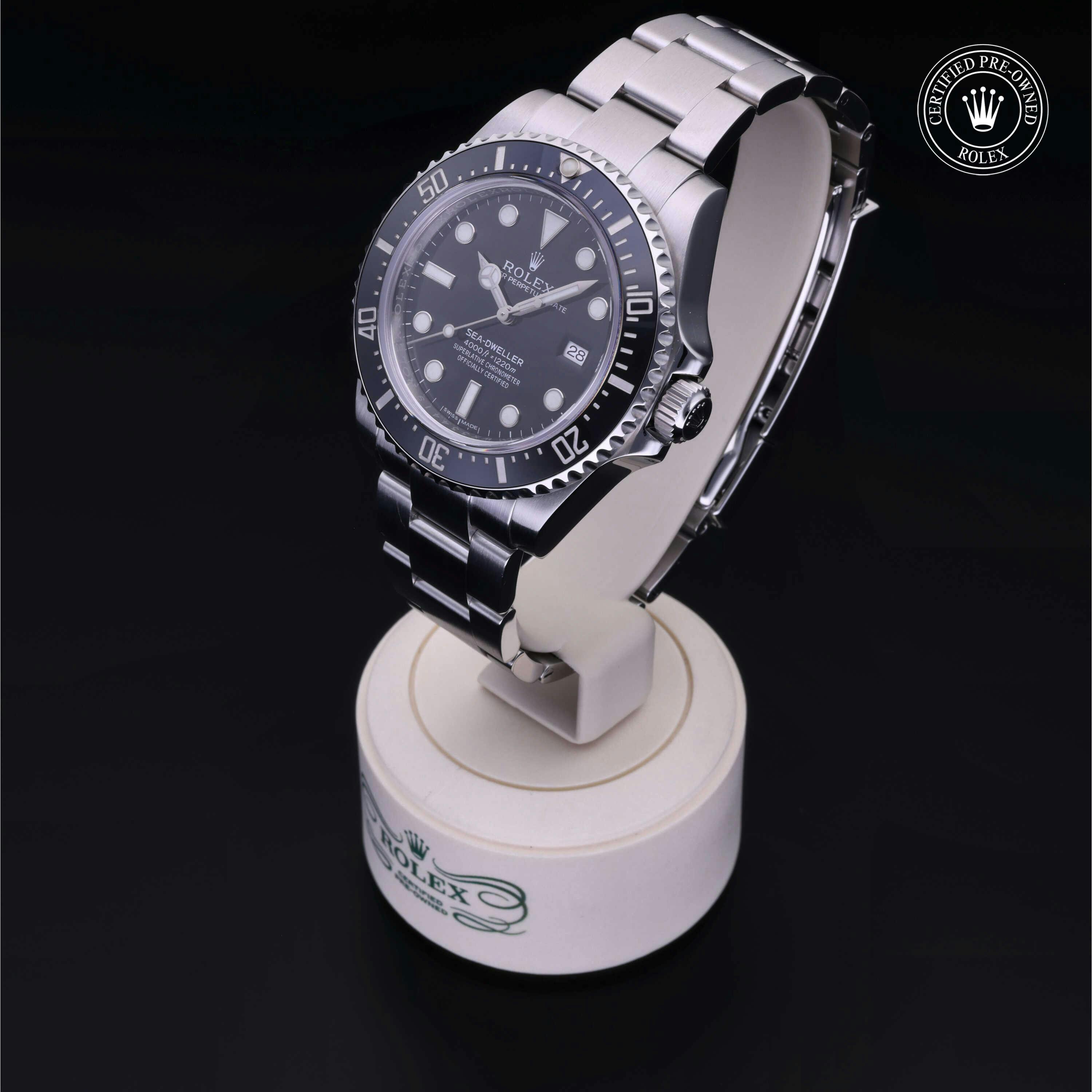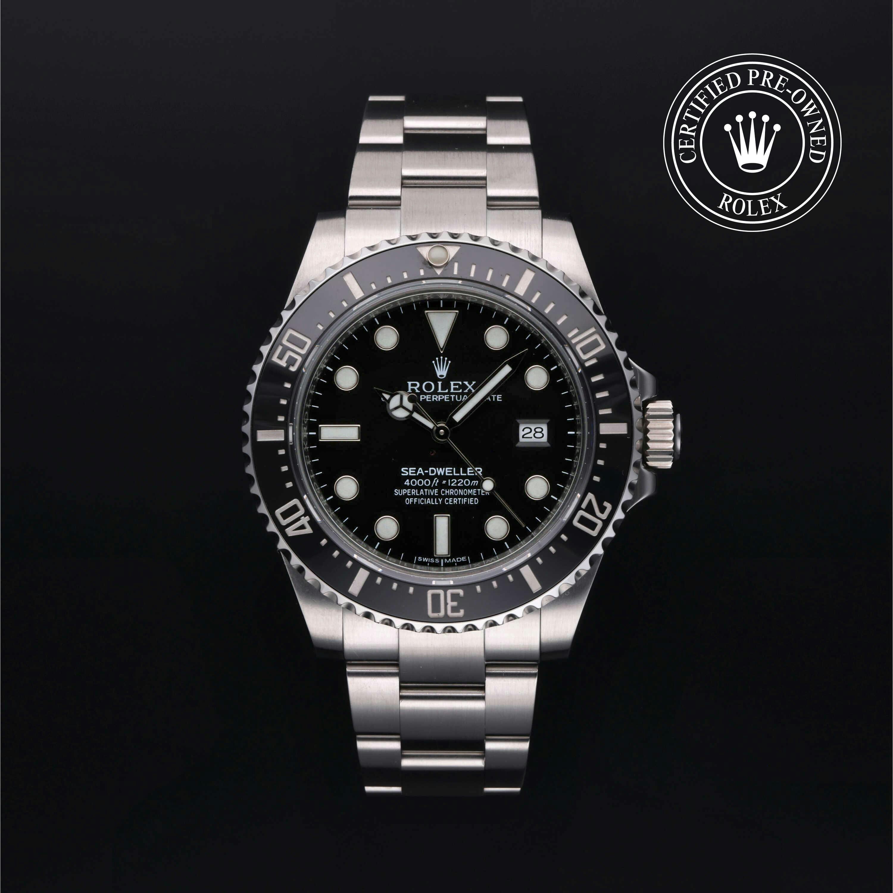 Rolex Certified Pre-Owned Sea-Dweller 4000 (116600) self - winding automatic watch, features a 40mm stainless steel case with a black cerachrom bezel insert surrounding a black dial on a stainless steel oyster bracelet. Functions include hours, minutes, seconds and date. This watch has received Rolex-authorized service and certification. It does not come with the original box or papers, but includes a custom Rolex Certified Pre-Owned hang tag, travel pouch and RCPO international warranty card.