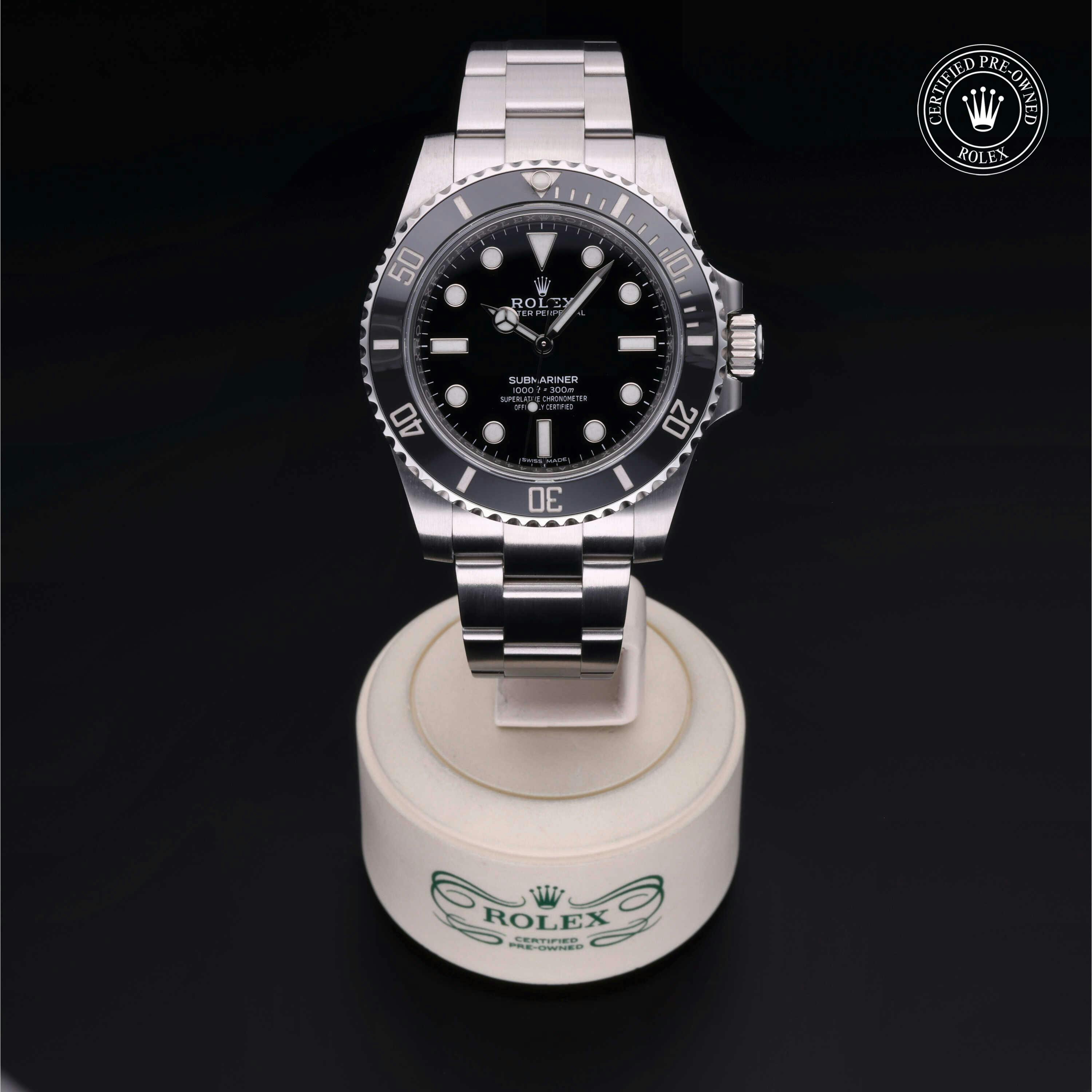 Rolex Certified Pre-Owned Submariner No Date (114060) self - winding automatic watch, features a 40mm stainless steel case with a black cerachrom bezel insert surrounding a black dial on a stainless steel oyster bracelet. Functions include hours, minutes and seconds. This watch has received Rolex-authorized service and certification. It does not include the original box or papers, but includes a custom Rolex-Certified Pre-Owned hang tag, travel pouch and international warranty card.
