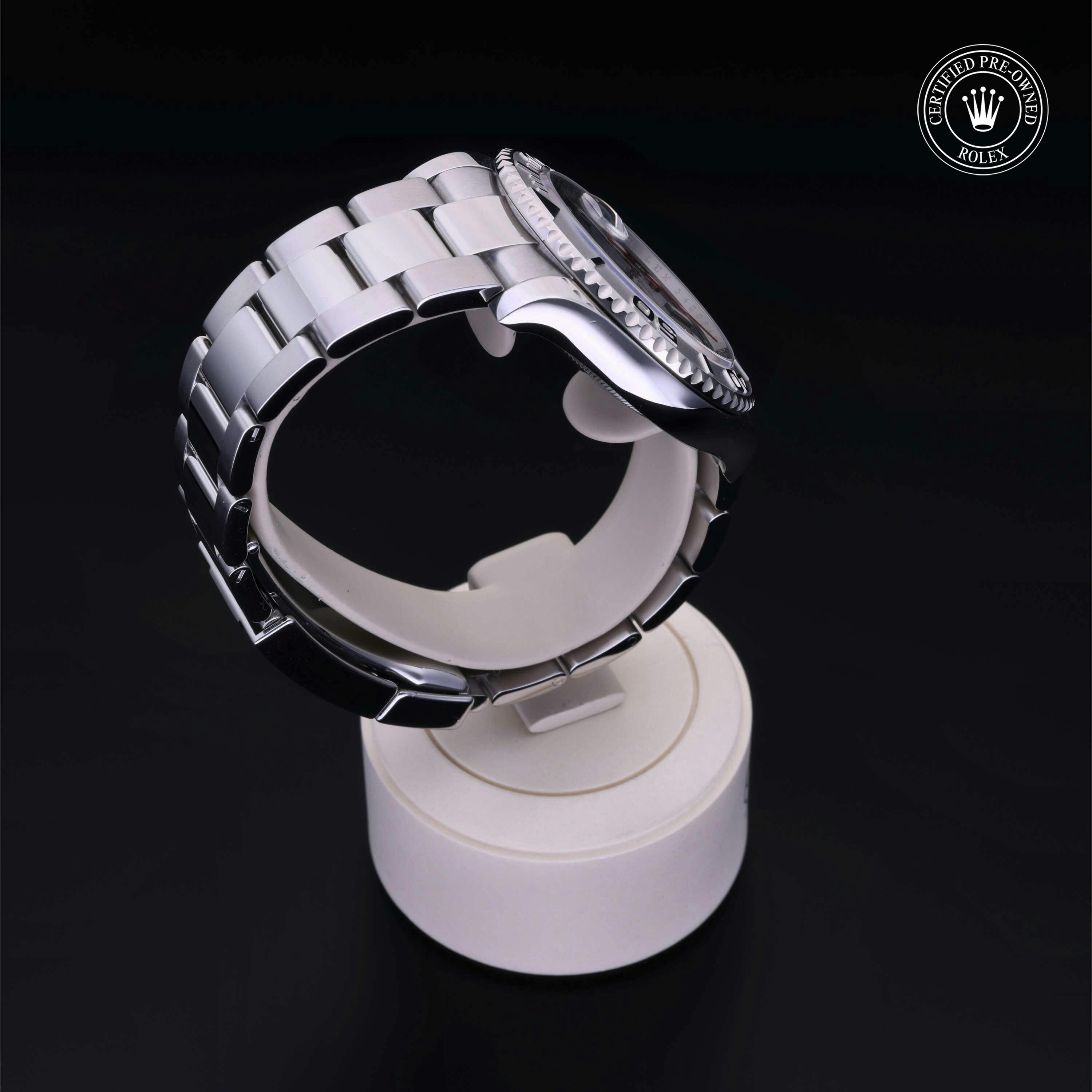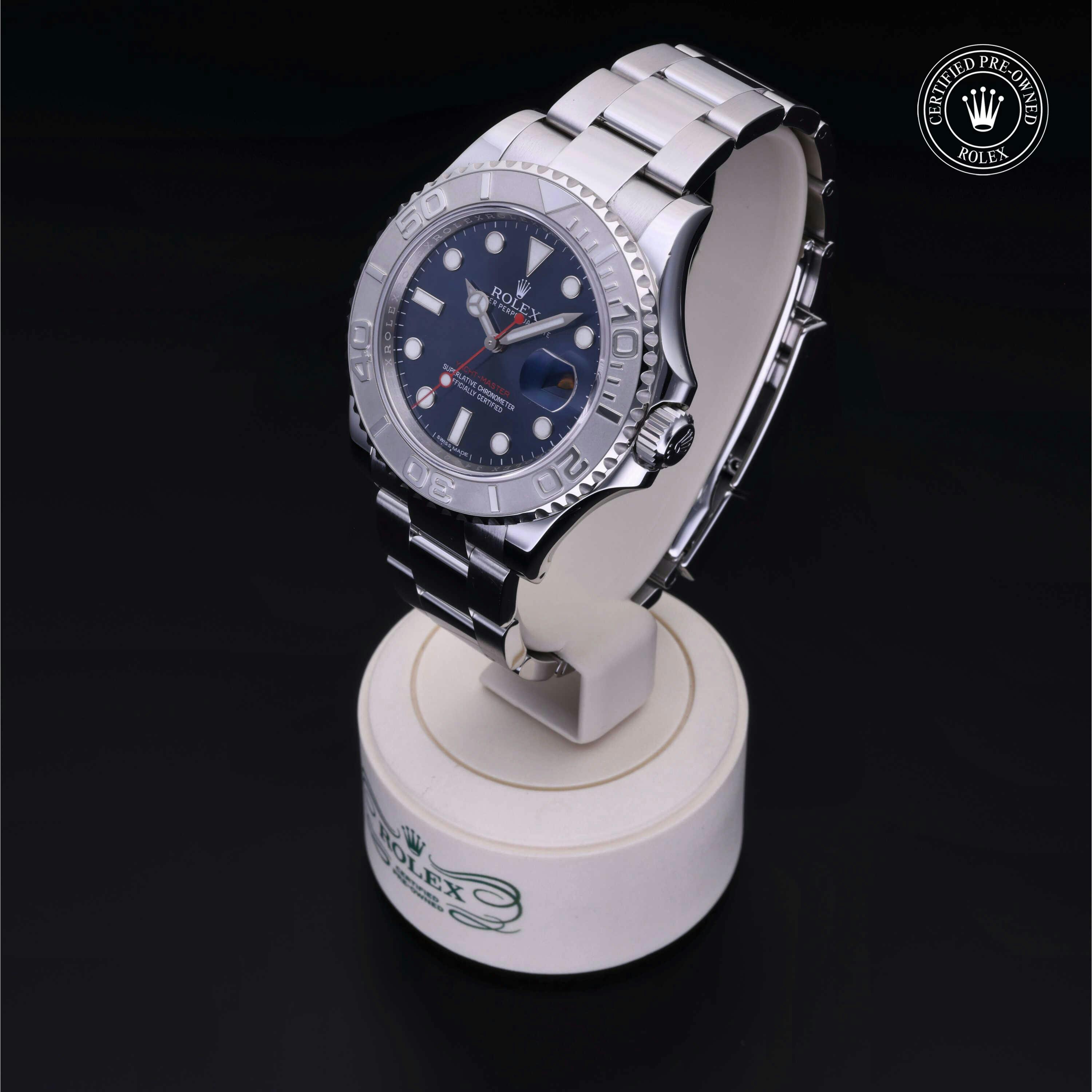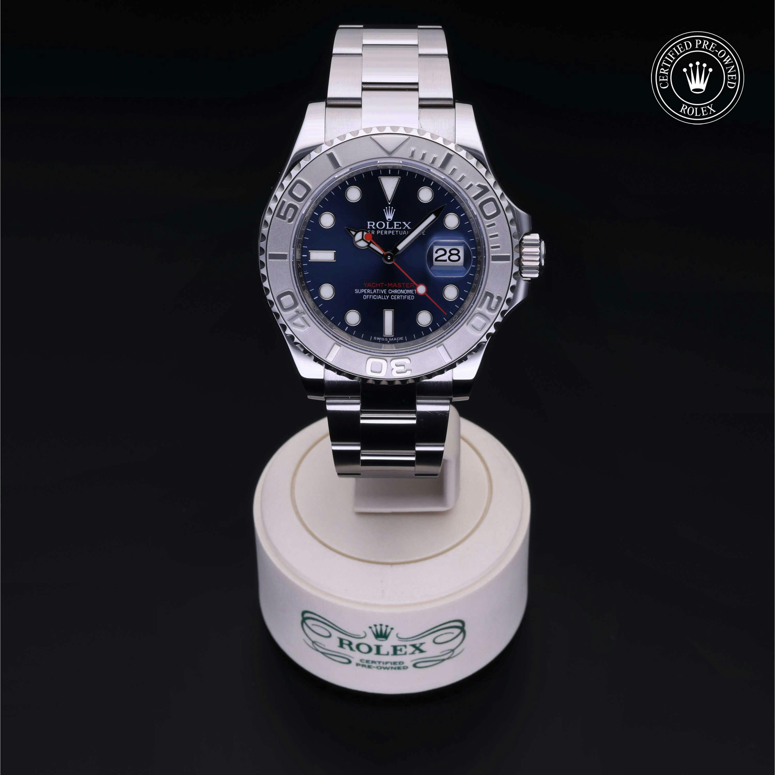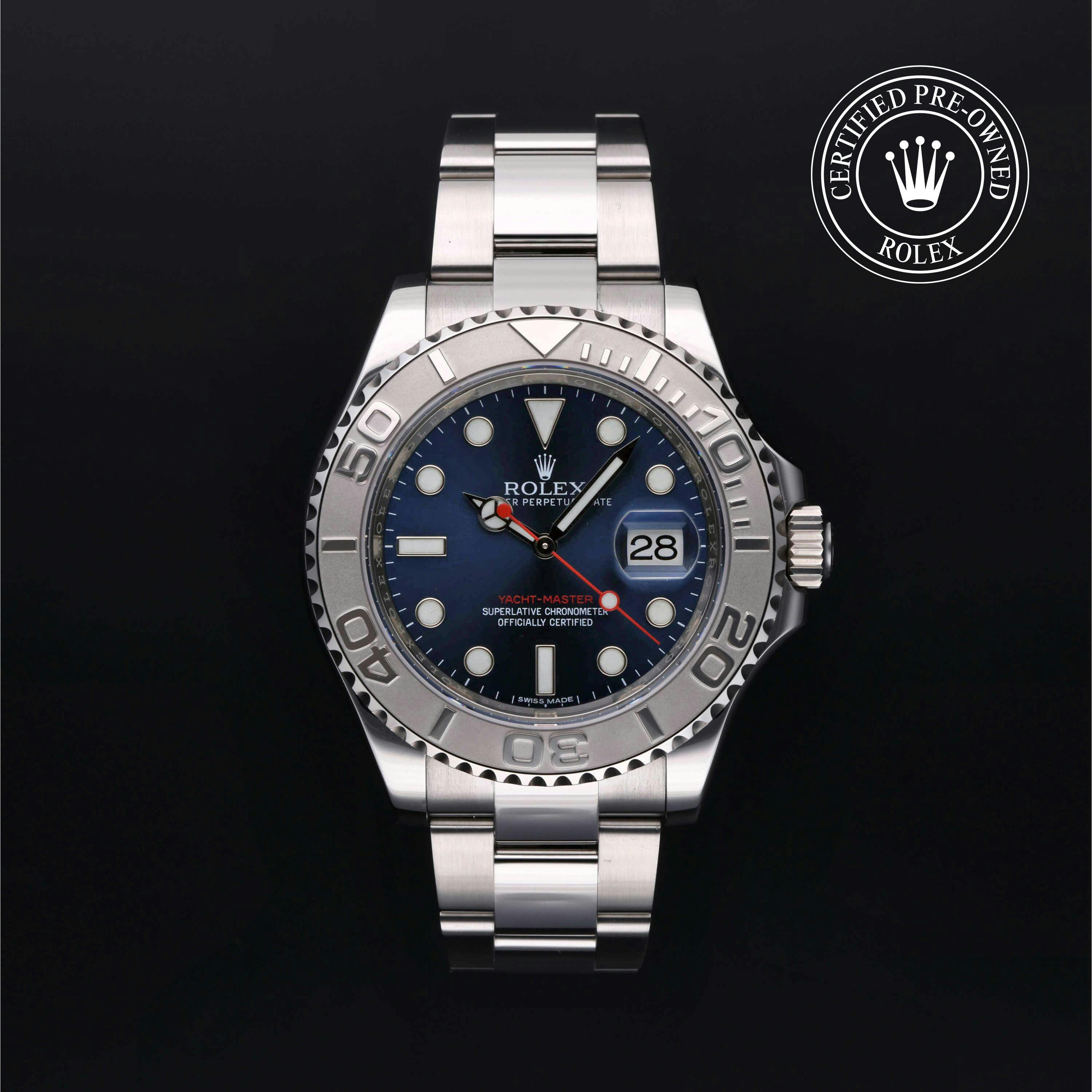 Rolex Certified Pre-Owned Yacht-Master (116622) self - winding automatic watch, features a 40mm stainless steel case with a platinum rotating bezel surrounding a blue dial on a stainless steel oyster bracelet. Functions include hours, minutes, seconds and date. This watch has received Rolex-authorized service and certification. It comes with the original box and papers, and includes a custom Rolex Certified Pre-Owned hang tag, travel pouch and RCPO international warranty card.