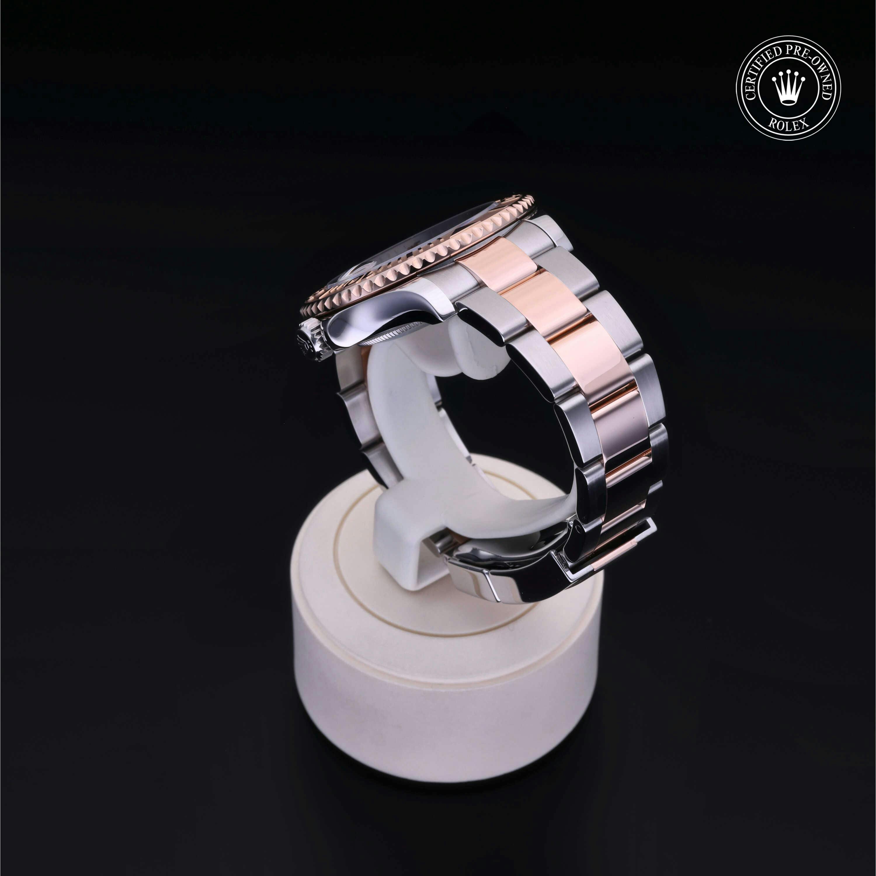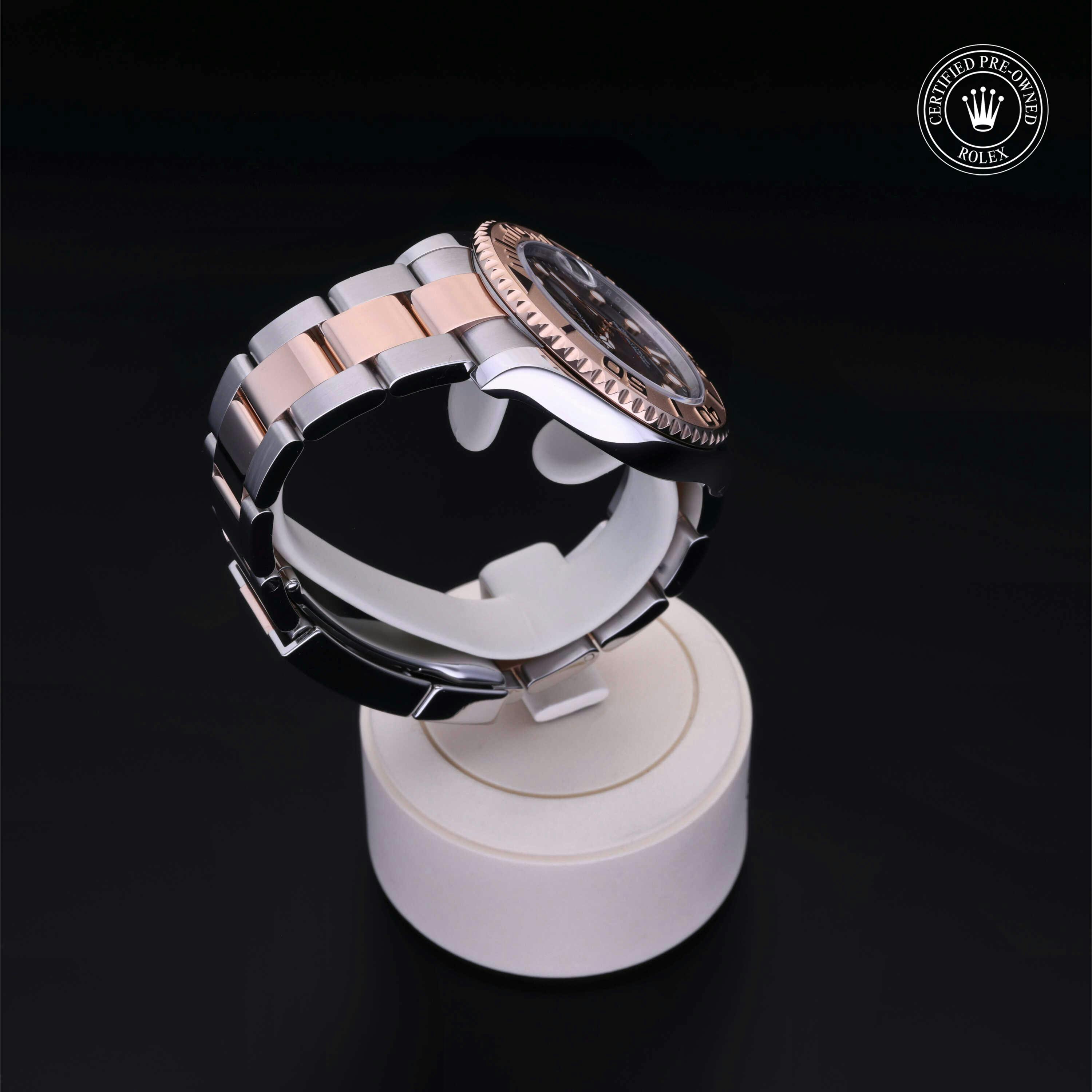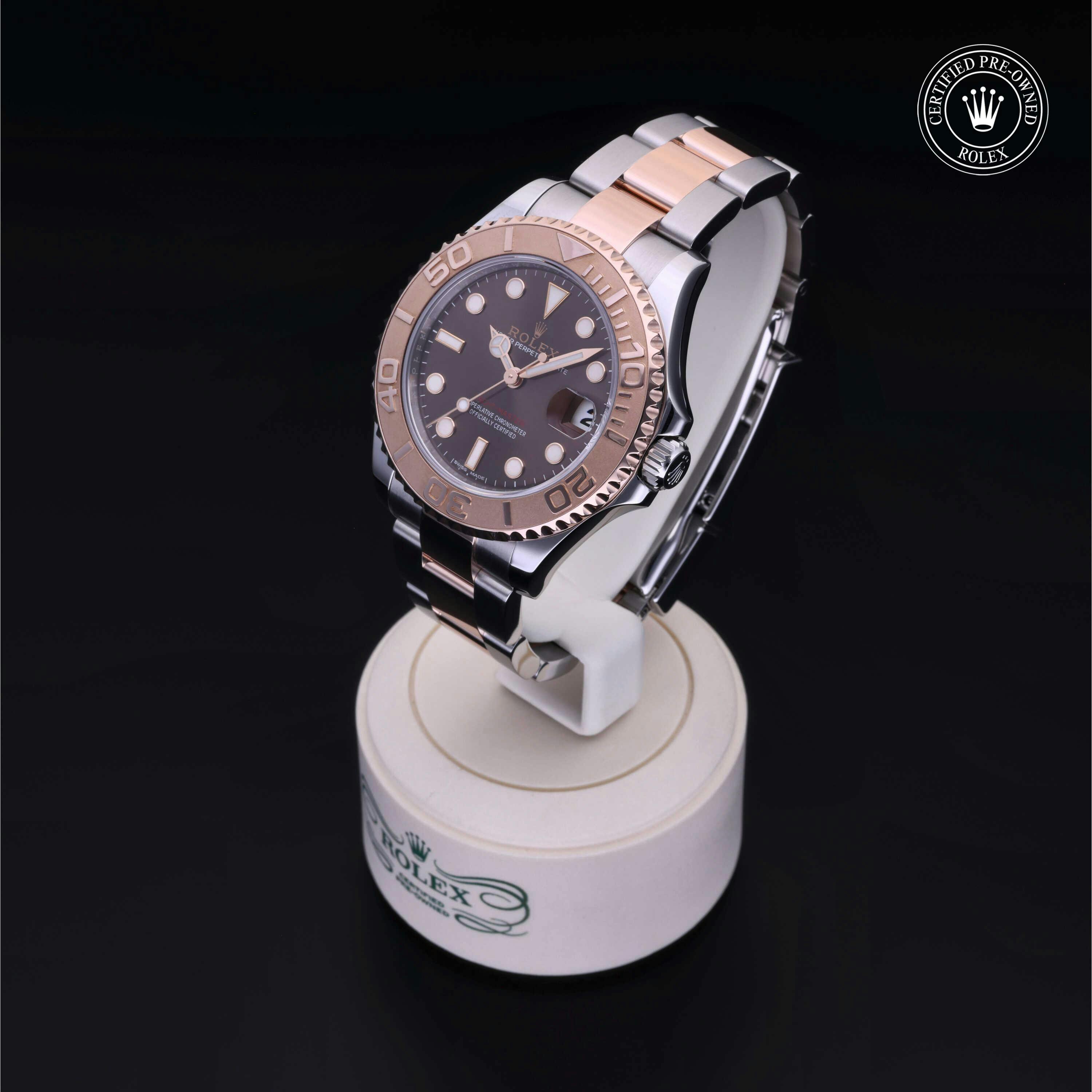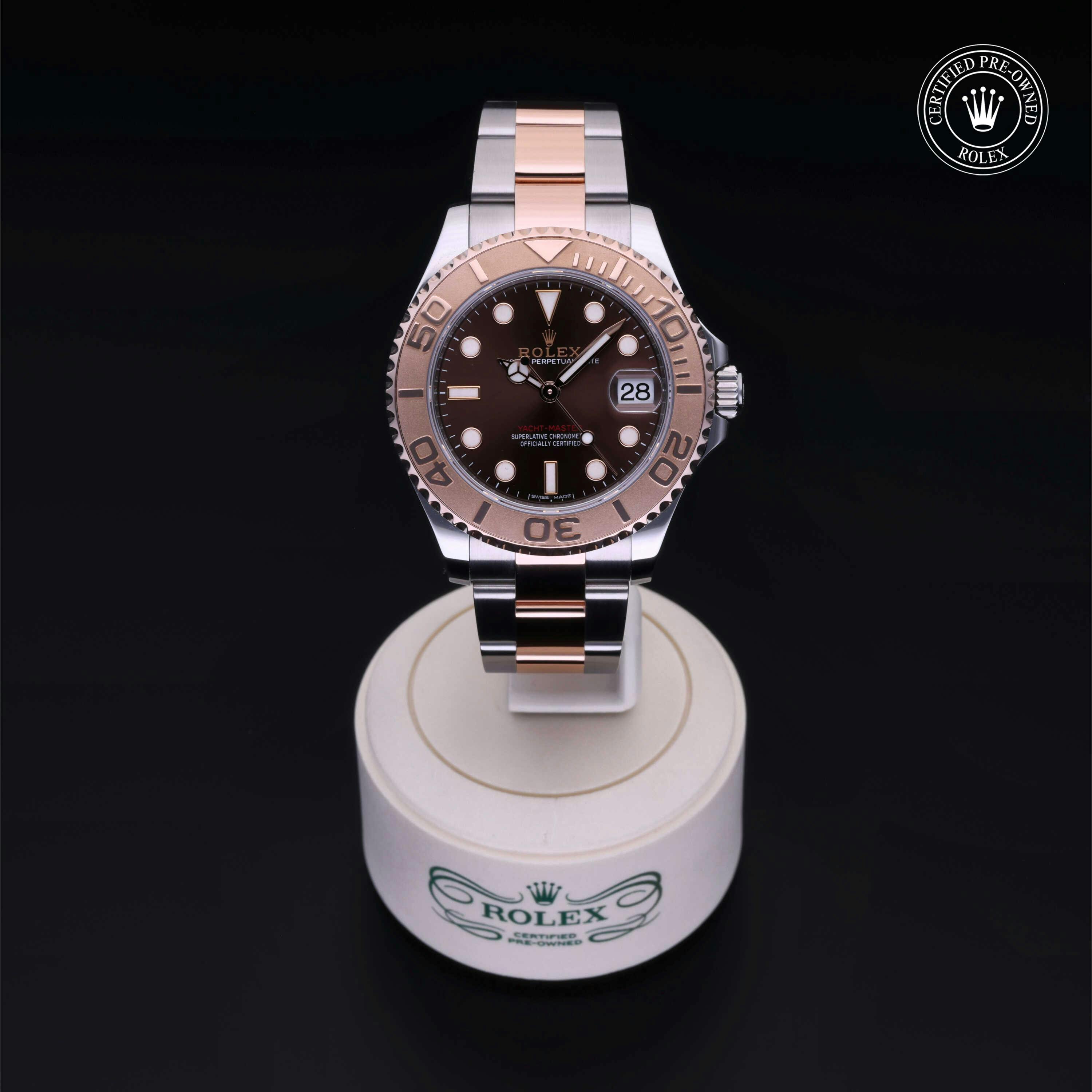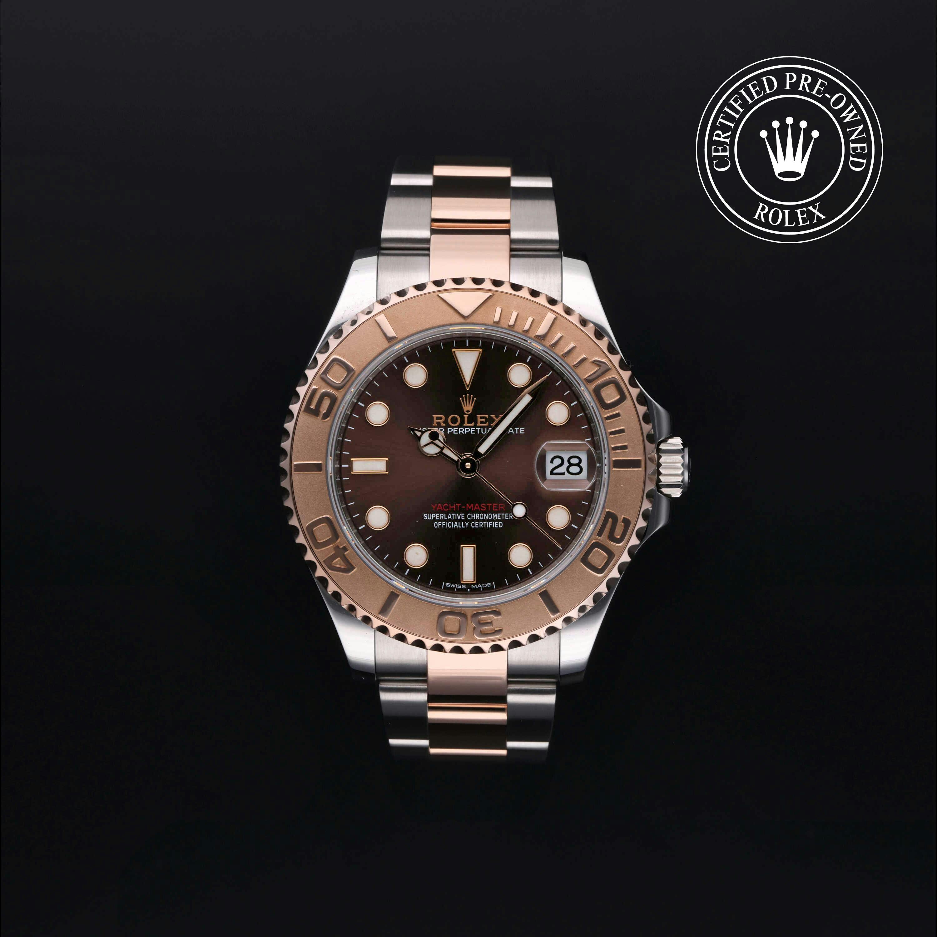 Rolex Certified Pre-Owned Yacht-Master (268621) self - winding automatic watch, features a 37mm stainless steel case with an 18k rose gold rotating bezel surrounding a chocolate dial on a stainless steel and 18k rose gold oyster bracelet. Functions include hours, minutes, seconds and date. This watch has received Rolex-authorized service and certification. It does not come with the original box or papers, but includes a custom Rolex Certified Pre-Owned hang tag, travel pouch and RCPO international warranty card.